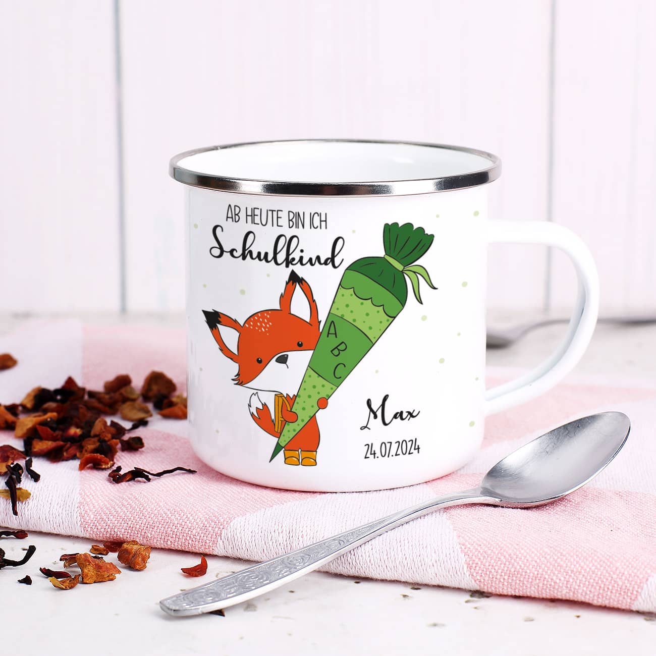 Die Metalltasse wird beidseitig mit dem süßen Schul-Fuchs bedruckt. Der Text "Ab heute bin ich Schulkind" wird durch Ihren Wunschnamen und dem Datum der Einschulung vervollständigt.