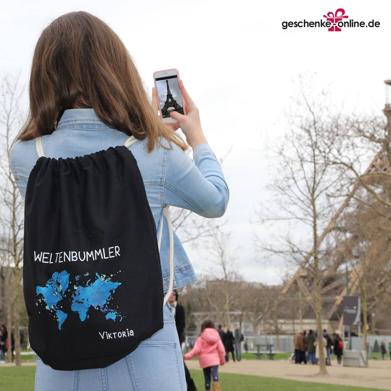 Der schwarze Rucksack wird mit der Aufschrift Weltenbummler, einer Weltkarte in Blautönen und Ihrem Wunschnamen einseitig bedruckt. Dadurch erhält der schlichte Rucksack einen ganz besonderen und individuellen Look, der garantiert so einzigartig ist, wie der Besitzer selbst.