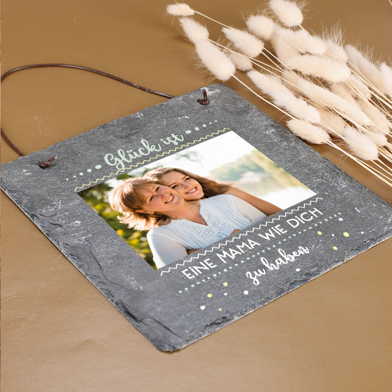 Verschenken Sie zum Muttertag ein ganz persönliches Präsent! Unsere bedruckte Naturschieferplatte zum Beispiel. Diese lässt sich kinderleicht mit Ihrem schönsten Foto und einem kurzen Wunschtext in ein individuelles Muttertagsgeschenk verwandeln. Gestaltet wird die dekorative Schieferplatte mit unserem hübschen "Glück ist" - Motiv. Dieses lässt sich mit einem passenden Text Ihrer Wahl gestalten und gemäß der Empfängerin oder dem Empfänger anpassen. Zu einem echten Hingucker wird die tolle Schieferplatte durch Ihr persönliches Wunschfoto. Dieses können Sie nach Ihren Vorstellungen auf dem Naturschiefer platzieren.