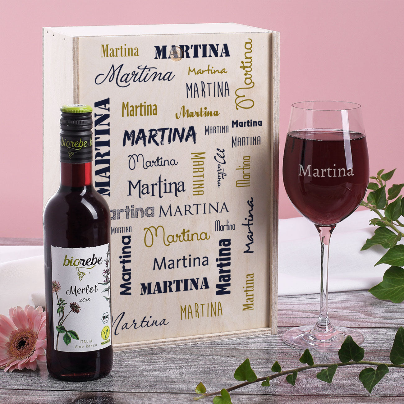 Biorebe Wein mit graviertem Glas und persönlicher Holzbox
