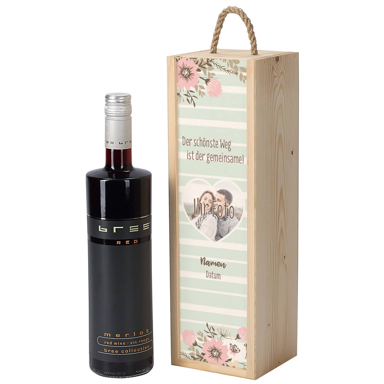 Das Geschenkset besteht aus einer Flasche Bree Wein in einer persönlich bedruckten Geschenkverpackung aus Holz. Damit Sie den Geschmack des Brautpaares auch treffen, bieten wir das Set mit 3 unterschiedlichen Weinen an. Sie können zwischen dem fruchtigen Roséwein, dem köstlichen Weisswein oder dem würzigen Rotwein wählen. Die Weine sind abgefüllt in der mit dem reddot Award ausgezeichneten Designflasche. Ein echter Hingucker wenn der Deckel der Holzbox aufgeschoben wird.