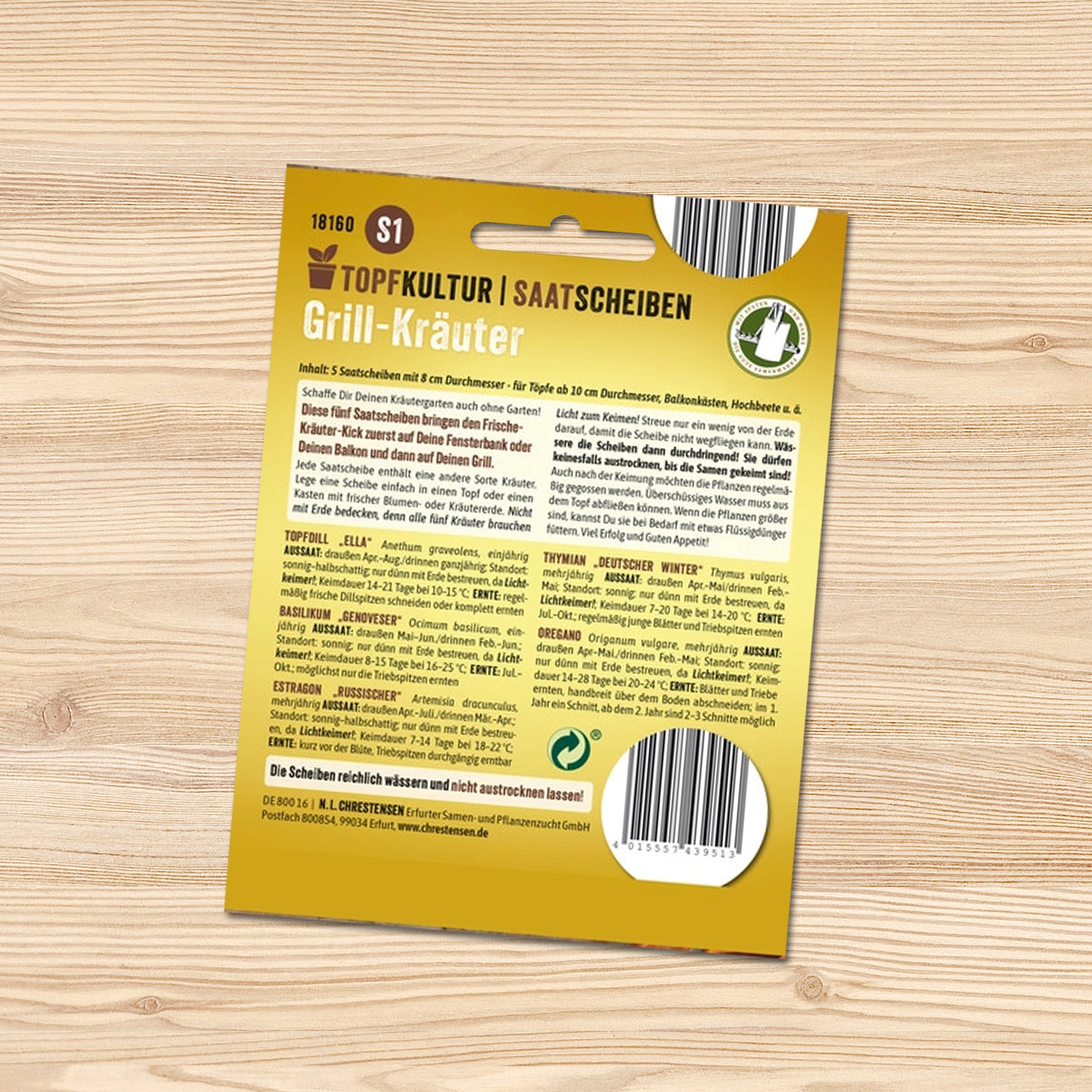 Praktisches Set mit 5 Saatscheiben für Balkon, Topf oder Hochbeet. Enthält je eine Sorte: Dill, Basilikum, Estragon, Thymian und Oregano. Ideal für frische Kräuter zum Grillen. Einfach auf Erde legen, leicht bedecken und feucht halten – perfekt auch für Einsteiger.