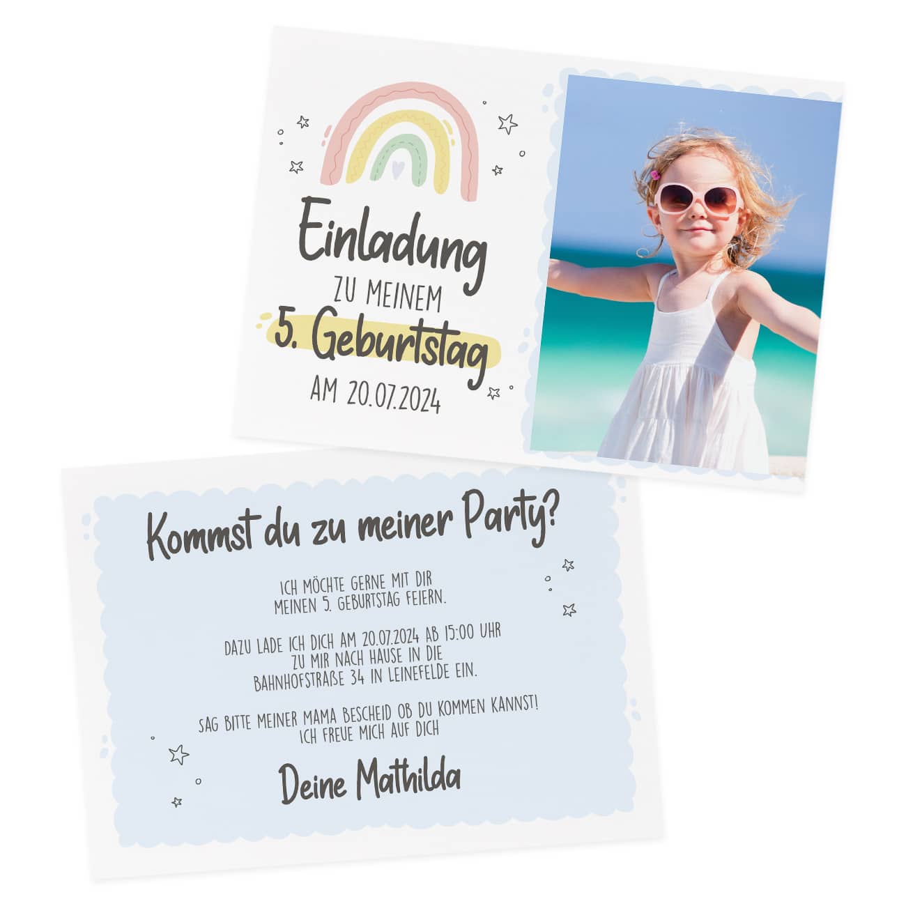 Einladungskarte zum Kindergeburtstag mit Foto und Regenbogenmotiv