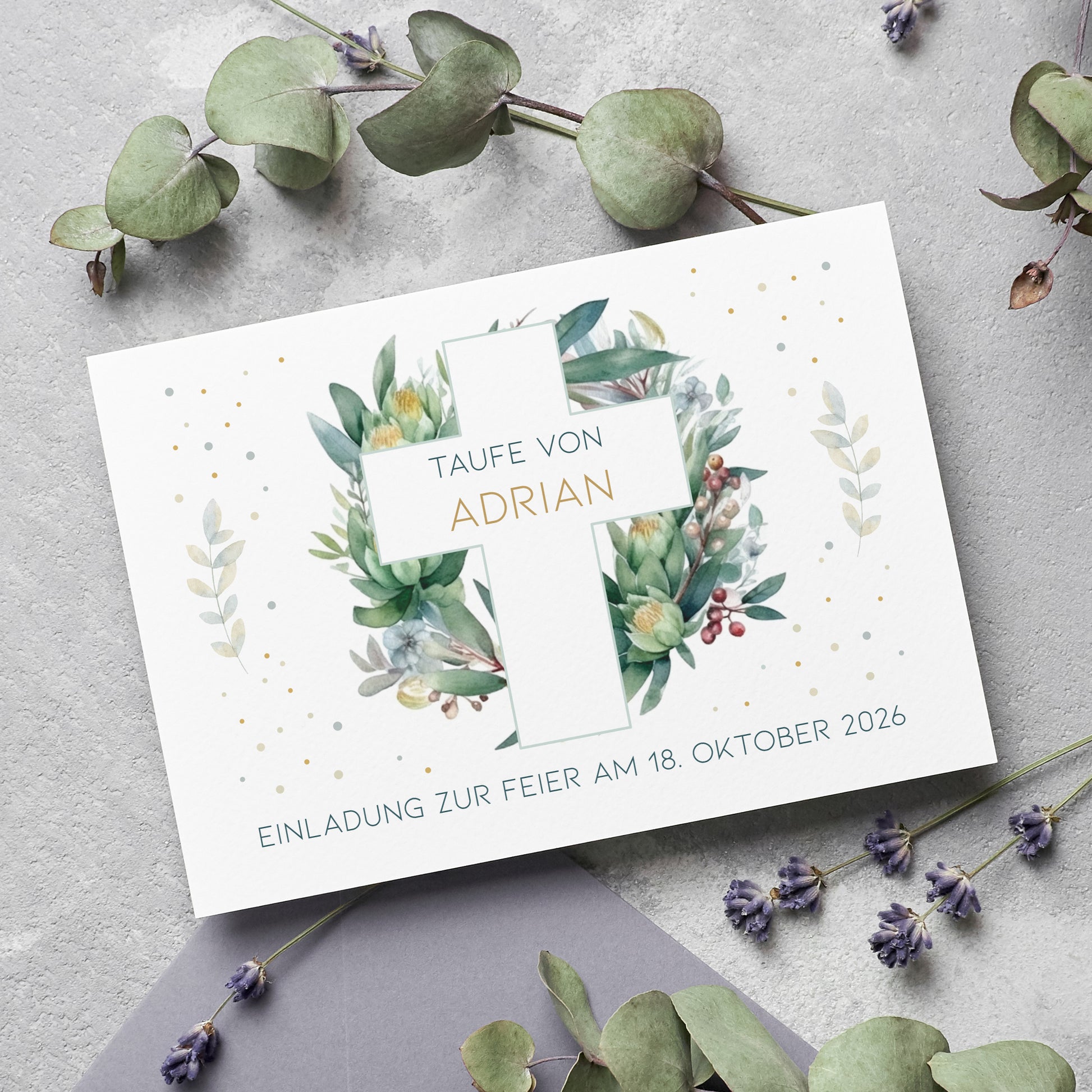 Diese elegante Einladungskarte mit christlichem Kreuz und einem stilvollen Kranz aus Blättern ist die perfekte Wahl für feierliche Anlässe wie Konfirmation, Kommunion oder Taufe. Die sanften Grüntöne verleihen ihr eine edle Optik, die sich harmonisch in jede Feier einfügt.