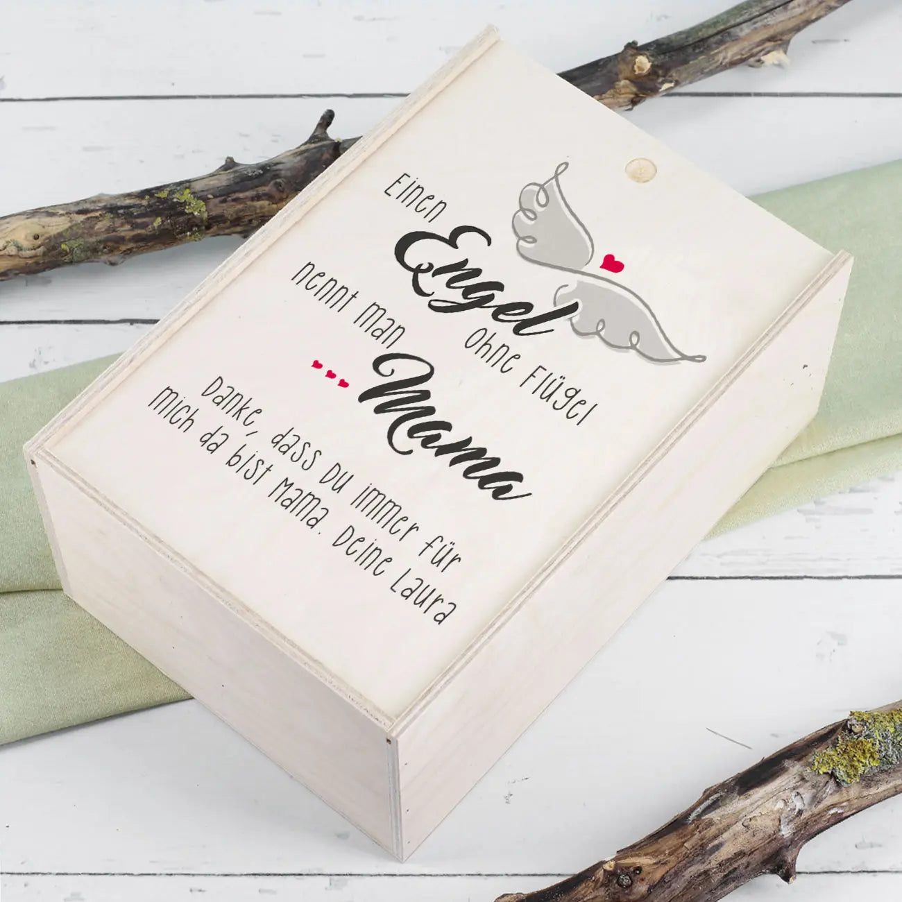 Jede Mutter freut sich über ein persönliches Geschenk zum Muttertag. Daran besteht kein Zweifel. Mit diesem sorgsam zusammengestellten Geschenkset zum Muttertag können Sie Ihrer Mama eine große Freude machen. Das wundervolle Präsent kommt in einer individuell bedruckten Holzbox daher und beinhaltet ein graviertes Weinglas und einen tollen Wein der Marke Biorebe. Die Geschenkverpackung besitzt die Maße 27 cm x 10,5 cm x 18 cm (B/H/T) und kann durch einen Schiebedeckel einfach geöffnet und geschlossen werden. Bedruckt wird dieser mit dem tollen Spruch "Einen Engel ohne Flügel nennt man Mama", Engelsflügel und einigen roten Herzen. Darunter steht Ihnen mit bis zu 120 Zeichen genügend Platz für persönliche Grüße zum Muttertag zur Verfügung. Lassen Sie Ihrer Kreativität hierbei freien Lauf. Die schöne Holzbox wird das Erste sein, was Ihre Mama von dem wundervollen Muttertagsgeschenk zu sehen bekommt. In Kombination mit unserem schmeichelnden Motiv und Ihren von Herzen kommenden Worten hinterlässt das dieses Wein-Set schon auf den ersten Blick einen bleibenden Eindruck. Sie können sich sicher sein, dass Ihre Mutter begeistert sein wird!