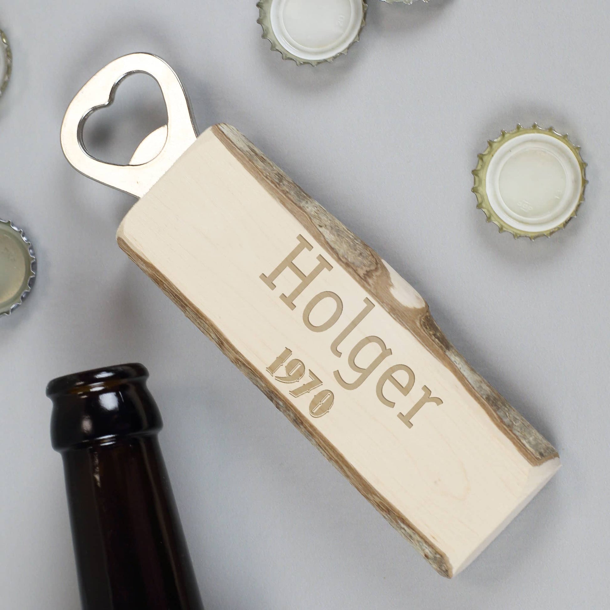 Flaschenöffner aus Holz mit Namensgravur und Jahr