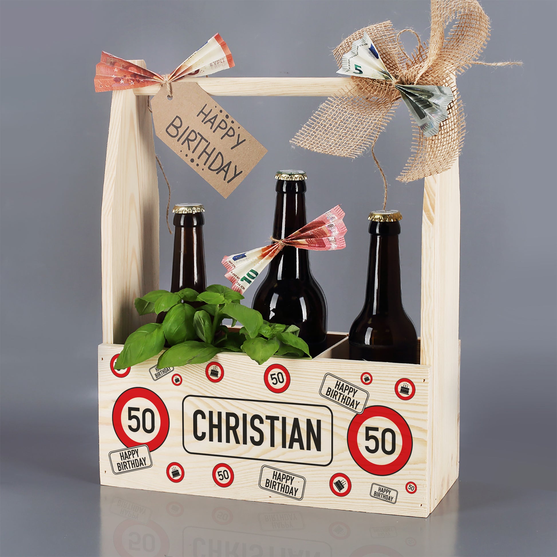 Flaschenträger aus Holz mit Verkehrszeichen, Alter & Name zum Geburtstag o. Jubiläum