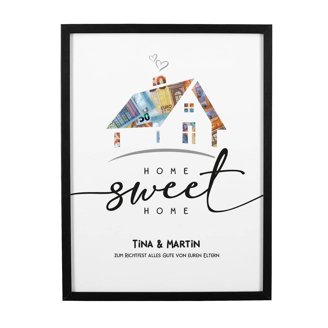 Feiern Sie den Beginn eines neuen Kapitels im Leben eines lieben Menschen mit unserem Geldgeschenk im Bilderrahmen, den Sie in Schwarz oder Natur erwerben können. Dieses Geschenk ist nicht nur eine liebevolle Geste, sondern eine symbolische Unterstützung für den Start in ein neues Zuhause. Das Poster mit der Aufschrift "home sweet home" verkörpert die Wärme und das Glück eines neuen Zuhauses. Doch das ist noch nicht alles - der Rahmen zum Einzug & Hausbau enthält einen einzigartigen Ausschnitt in Form eines Hauses, der Platz für Ihre Geldscheine bietet. Dieses Detail verleiht dem Geldgeschenk eine kreative Note und zeigt gleichzeitig praktische Unterstützung.