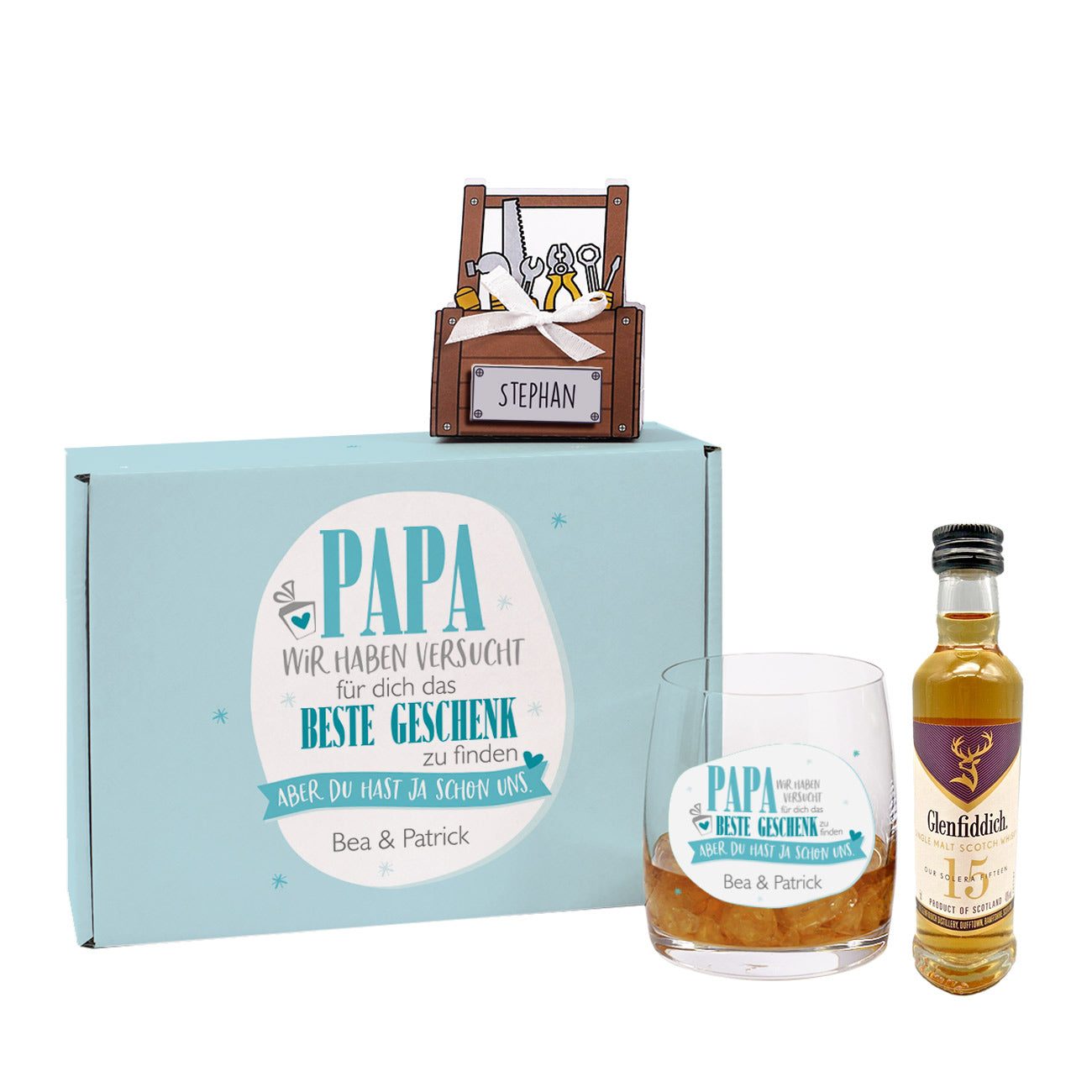 Dieses abgerundete Geschenk ist ein tolles personalisiertes Geschenkset für Papa, wenn dieser zu einem guten Whisky und süßer Schokolade nicht "Nein" sagen kann. Zum Geschenkset gehört eine personalisierte Geschenkverpackung und ein Whiskyglas, welche beide einen witzigen Spruch als Druck erhalten. Hinzu kommt eine kleine Schachtel mit 3 Lindorkugeln, die wie ein kleiner Werkzeugkasten aussieht. Zuletzt noch ein Glenfiddich Whisky, der dann das neue Whiskyglas einweiht. Personalisierte Geschenke wie dieses machen zum jedem Anlass Freude, beispielsweise als Vatertagsgeschenk, Geburtstagsgeschenk oder auch Weihnachtsgeschenk. Dank der Auswahl an der Variante "Ich" oder "Wir" kann das Geschenkset von Ihnen alleine oder gemeinsam mit den Geschwistern überreicht werden.