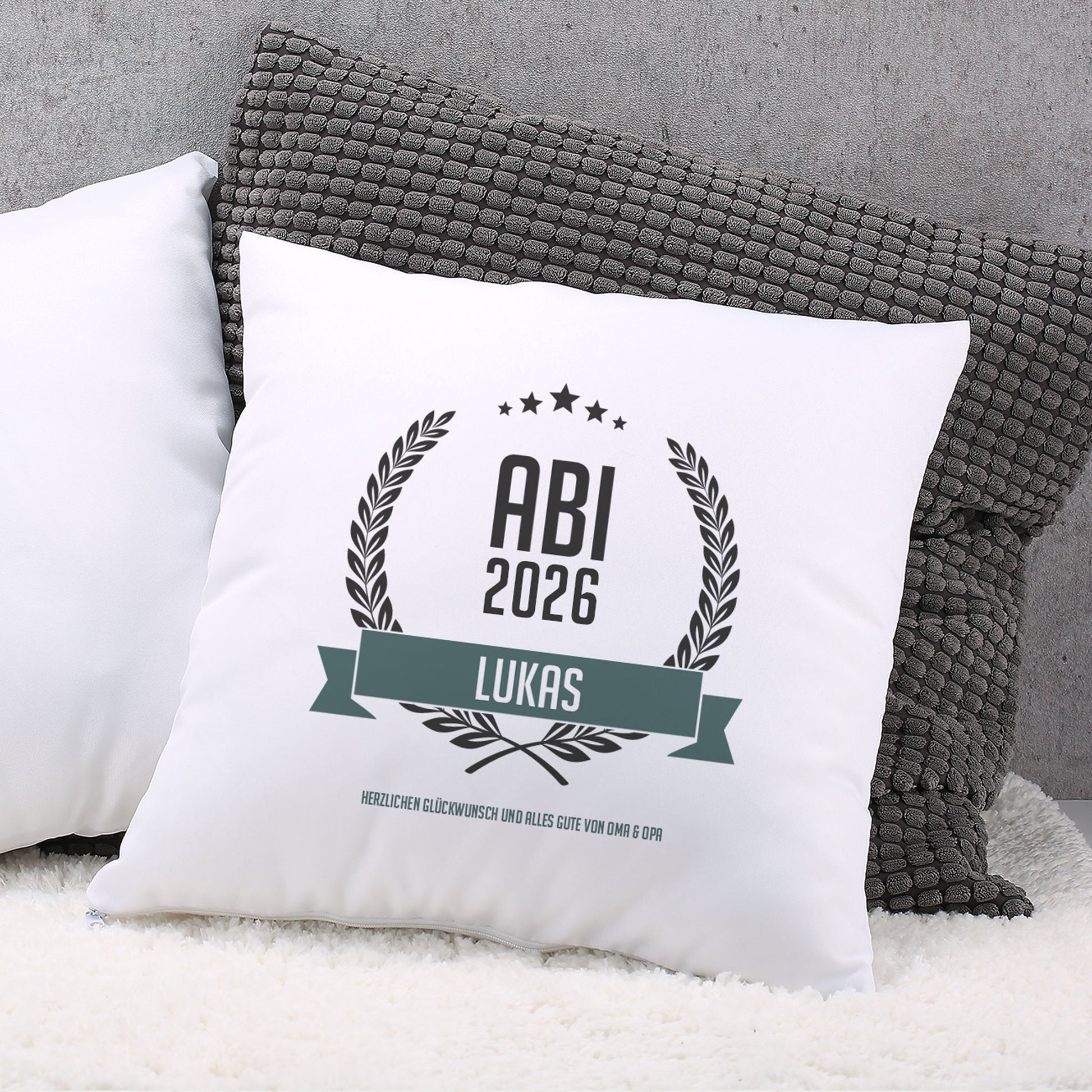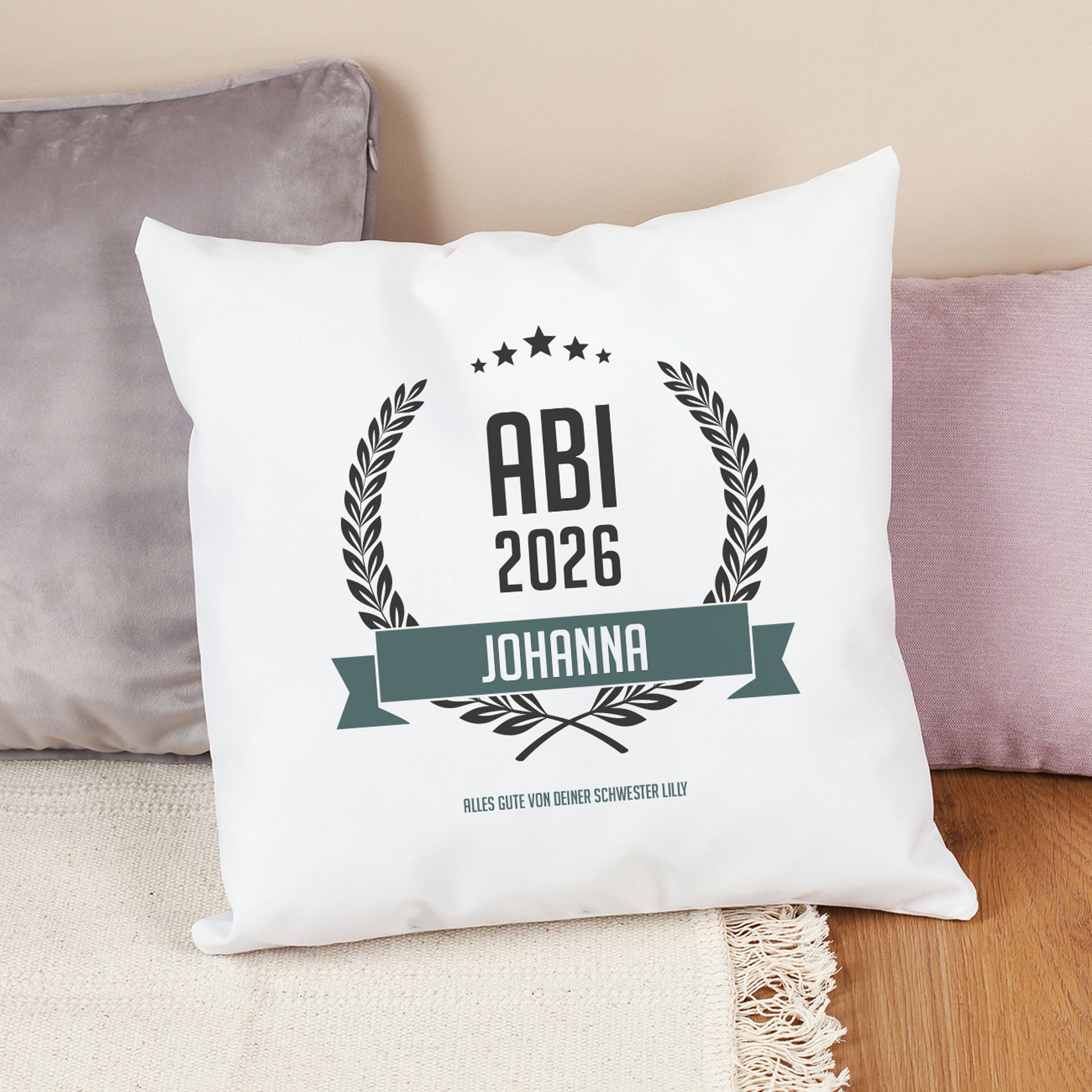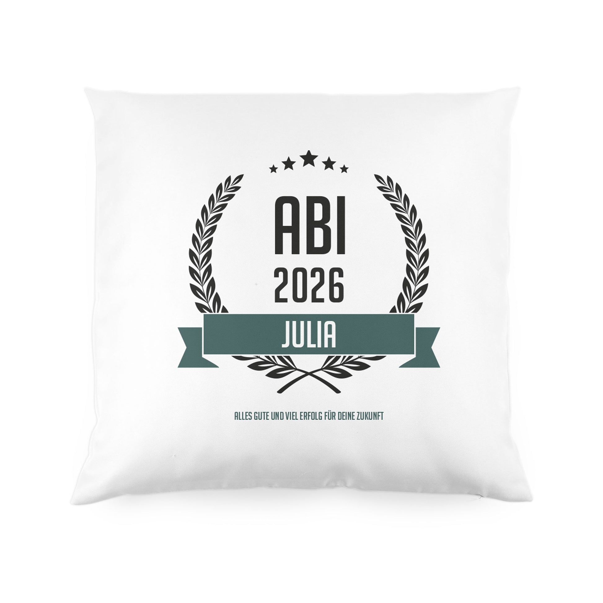 Das weiche, weiße Kissen zum Abitur wird einseitig mit einem Ährenkranz dem Schriftzug ABI und Ihrem gewünschten Namen bedruckt. Hinzu kommt Ihr selbst verfasster Text für Glückwünsche. Fertig ist ein cooles Wohnaccessoire für den glücklichen Schulabgänger.