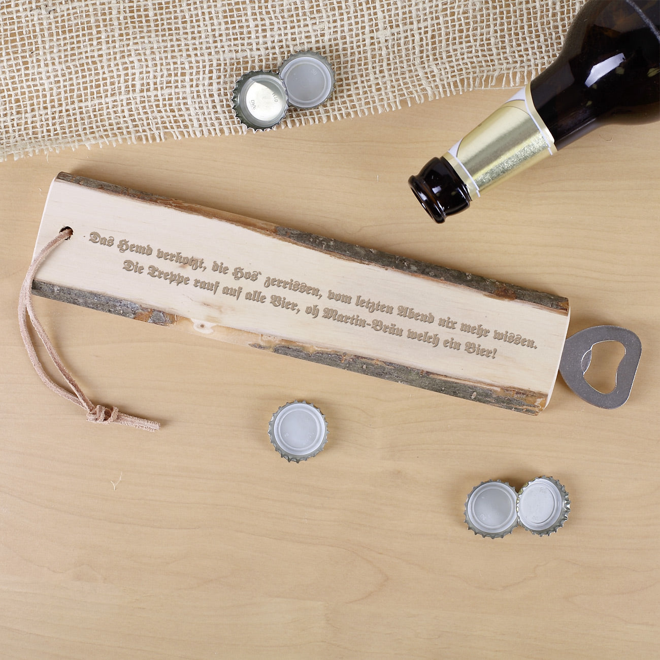 Ihr Wunschname wird mit folgendem Spruch auf den Flaschenöffner graviert: "Das Hemd verkotzt, die Hos` zerrissen, vom letzten Abend nix mehr wissen. Die Treppe rauf auf alle Vier, oh ... Bräu welch ein Bier!"