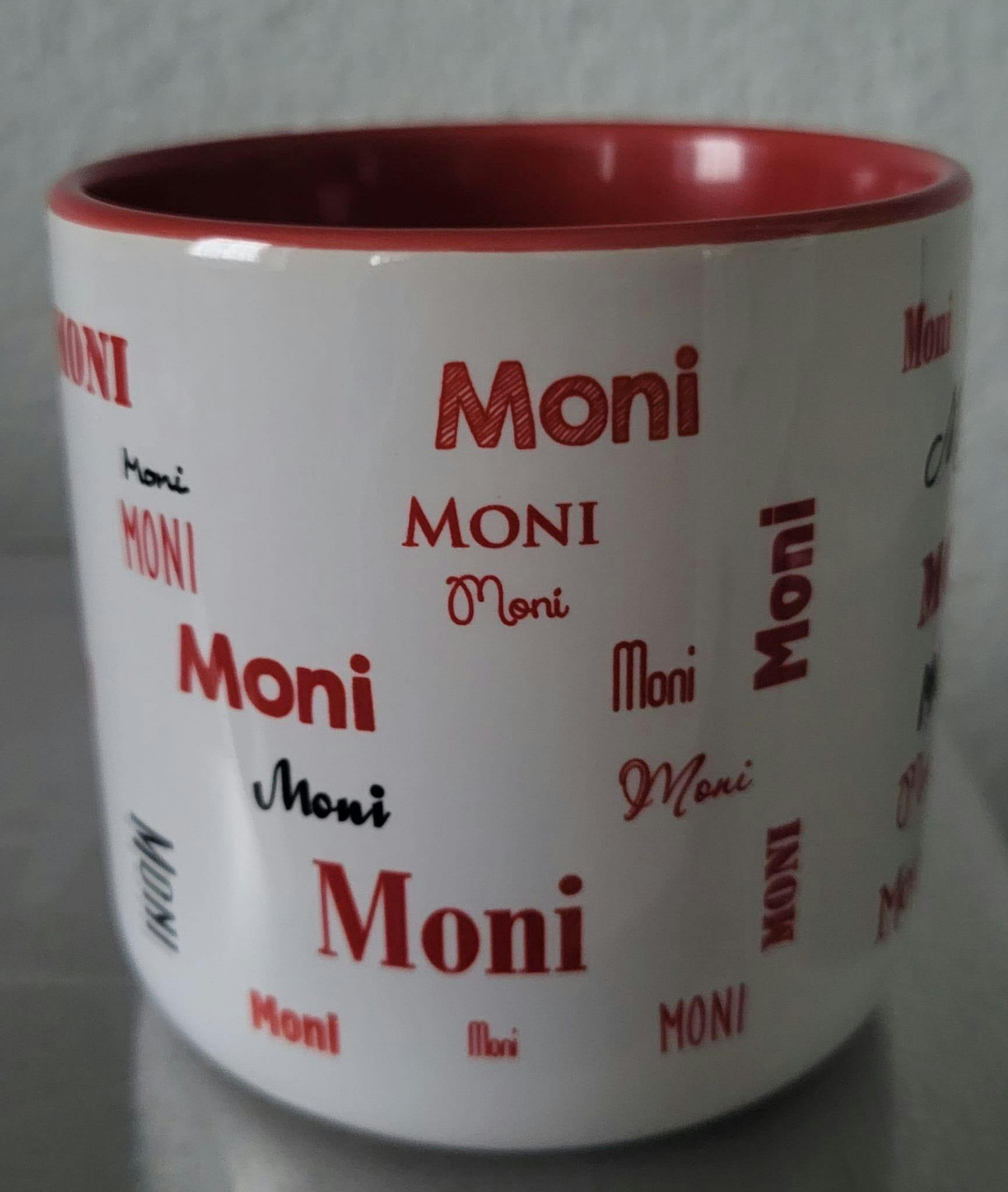 Weißer Keramikbecher mit buntem Innenleben und Namensaufdruck in verschiedenen Farben