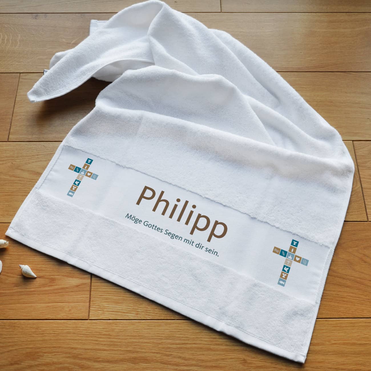 Dieses flauschig weiche Handtuch im Format 50 x 100 cm ist ein nützliches Geschenk mit Botschaft. Der einseitige Aufdruck besteht aus zwei Kreuzen in verschiedenen Braun- und Blautönen. Diese Kreuze setzen sich aus einzelnen religiösen Symbolen zusammen. Dazu gehören zum Beispiel: Kerze, Kelch, Taube, Brot und Wasser. Hinzu kommt Ihr gewünschter Name sowie einem Zusatztext, der den Anlass, das Datum oder einen Segenswunsch enthalten kann.
