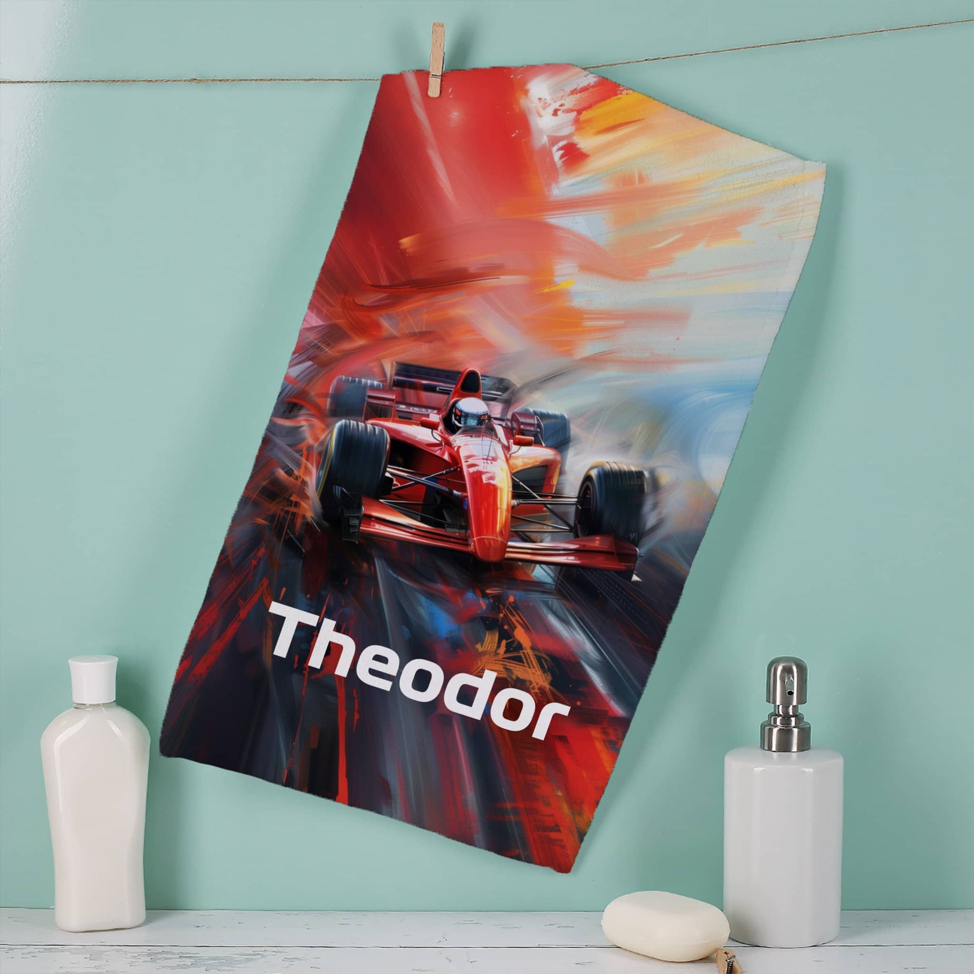 Handtuch mit Rennwagen in 3 Größen mit Wunschname bedruckt
