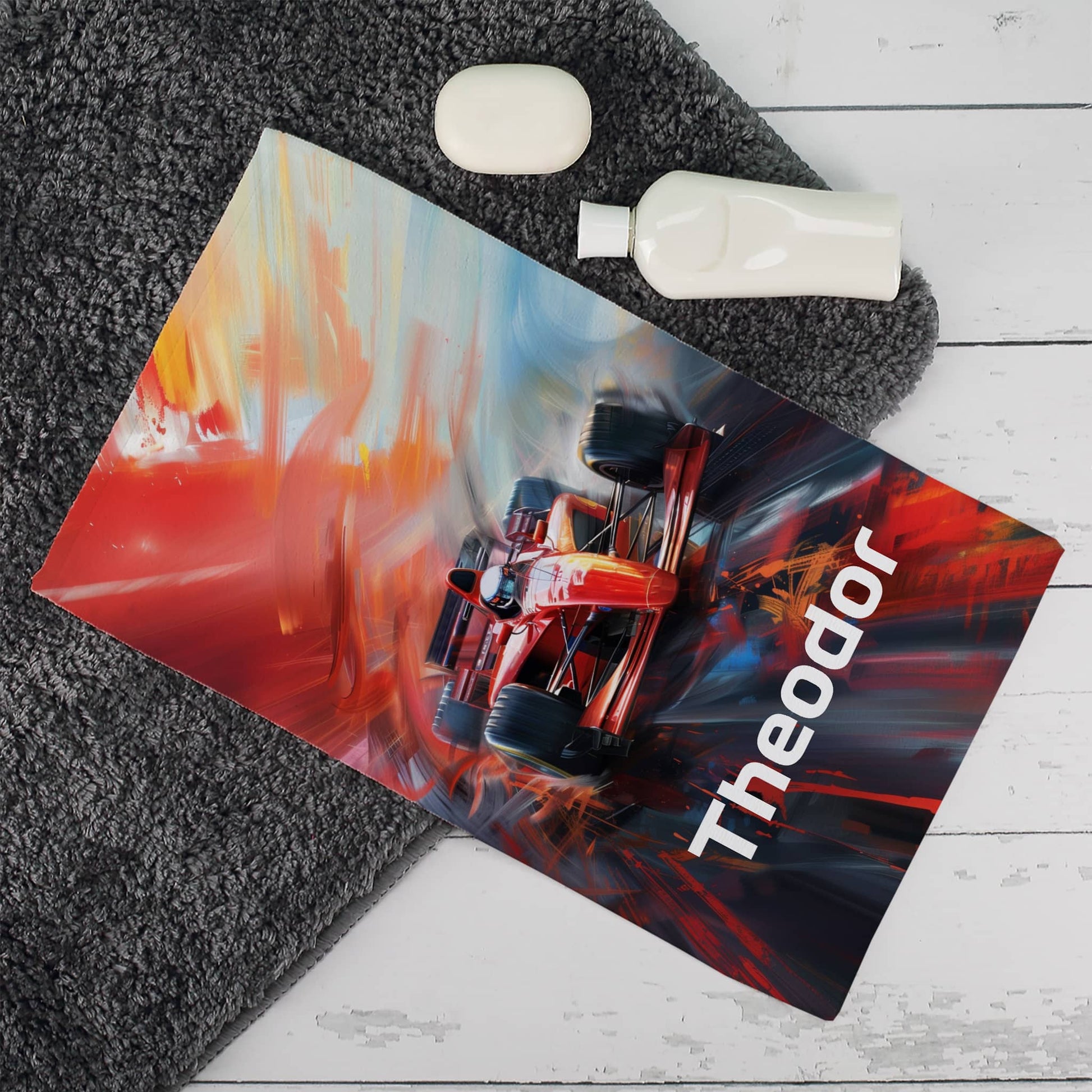 Ob großes Badetuch, handliches Handtuch oder kompaktes Gästehandtuch – das Design ist in drei praktischen Größen erhältlich und bietet für jede Situation das Passende. Das auffällige Rennauto-Motiv ist auf hochwertigem Material bedruckt und sorgt dafür, dass das Handtuch nicht nur funktional, sondern auch ein echter Hingucker ist. Der personalisierte Name hilft, Verwechslungen zu vermeiden und macht das Handtuch zu einem individuellen Highlight.