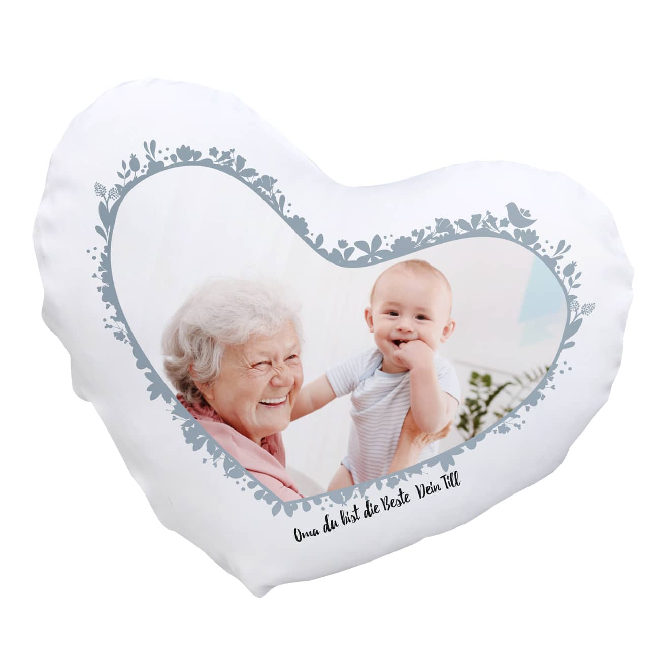 Achten Sie bei der Auswahl Ihres Fotos darauf, dass das Bild im Querformat benötigt wird und dass beim Einpassen Ihres Fotos in die Herzform große Bildabschnitte wegfallen. Es empfiehlt sich daher Bilder zu verwenden, bei denen das Motiv nicht direkt am Rand, sondern mehr im Mittelpunkt liegt. Sollte nicht klar erkennbar sein, welcher Ausschnitt des Bildes verwendet werden soll, senden Sie eine kurze Erläuterung in der Bestellung mit. Die Umrandung des Fotos besteht aus floralen Elementen in einem blaugrauen Farbton.