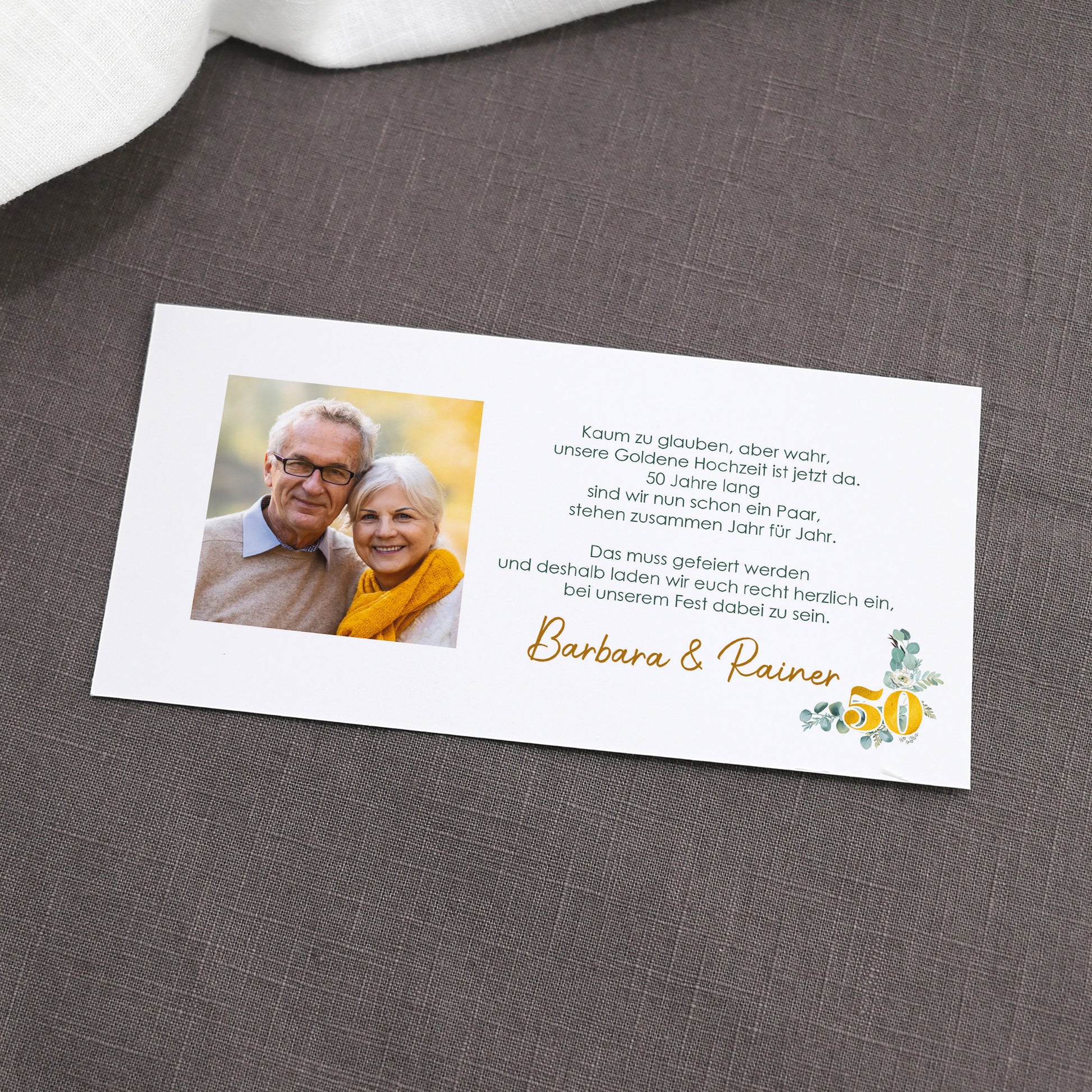 Machen Sie Ihre Goldene Hochzeit zu einem unvergesslichen Ereignis – mit einer Einladung, die Ihre 50 gemeinsamen Jahre würdigt. Jetzt personalisieren & bestellen!