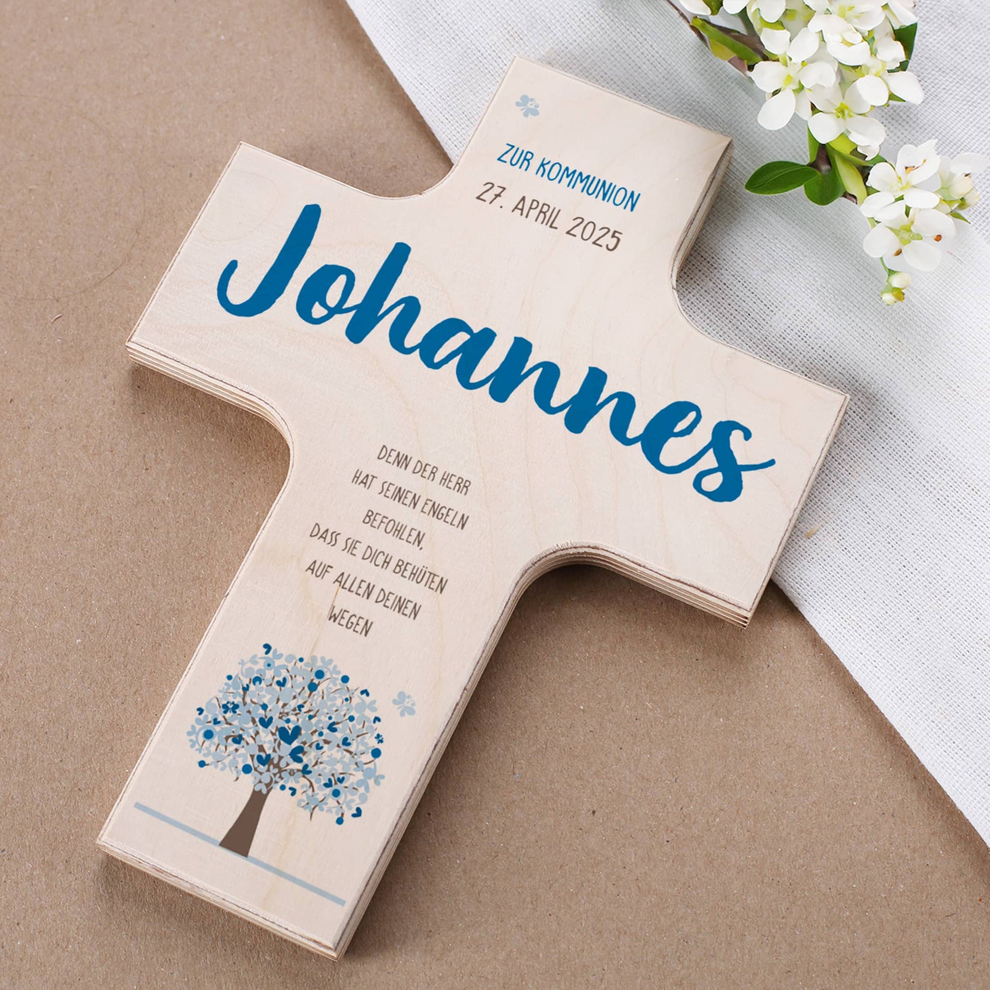 Dieses hochwertige Holzkreuz aus Ahornholz ist ein wunderschönes und bedeutungsvolles Geschenk für besondere religiöse Anlässe wie Taufe, Kommunion oder Konfirmation. Das Kreuz wird mit einem Lebensbaum-Motiv gestaltet und kann individuell mit Namen, Datum und einem persönlichen Bibelspruch bedruckt werden. Es ist in drei ansprechenden Farben – Blau, Grün oder Rosa – erhältlich, sodass es passend zu jedem Geschmack und Anlass gestaltet werden kann.