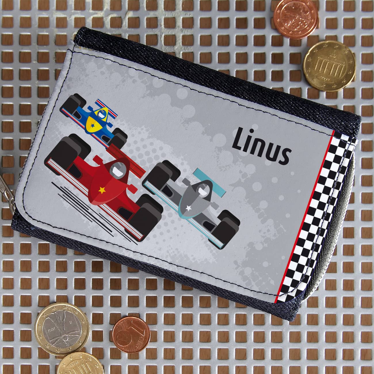 Jeans-Geldbörse für Kinder mit Name und Rennwagen