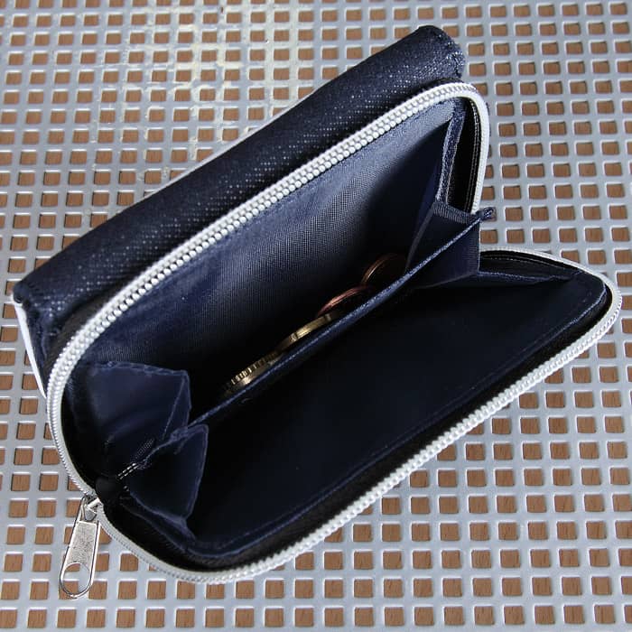 Das Portemonnaie enthält: 1 Reißverschlussfach für Kleingeld, 1 großes Fach für Geldscheine, 5 Visitenkartenfächer und 1 mit einem Sichtfenster versehenes Fach.