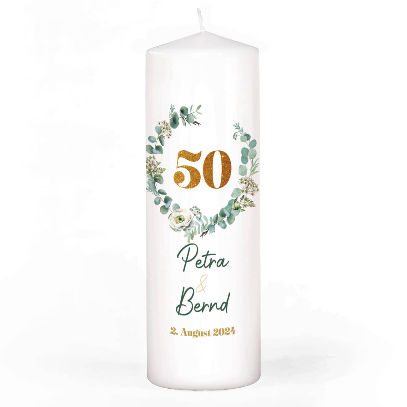 Kerze zum 50. Hochzeitsjubiläum mit Namen und Datum bedruckt