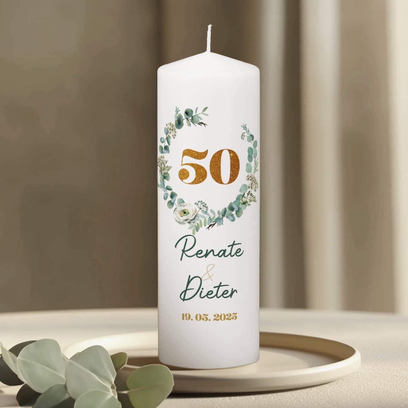 Entdecken Sie die personalisierbare Kerze zum 50. Hochzeitsjubiläum, bedruckt mit einem eleganten Eukalyptus-Motiv und einer goldenen 50. Perfekt als festliche Dekoration oder als Geschenk zur goldenen Hochzeit. Die bedruckte Kerze zum 50. Hochzeitsjubiläum ist ideal für den besonderen Anlass der goldenen Hochzeit. Mit der Möglichkeit, Namen und Datum hinzuzufügen, schafft diese Kerze eine bleibende Erinnerung an den bedeutenden Meilenstein. Die Kerze bietet eine beeindruckende Brenndauer von ca. 120 Stunden, wodurch sie nicht nur während der Feier, sondern auch danach für romantische Momente genutzt werden kann.