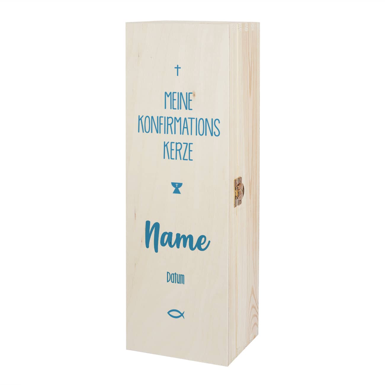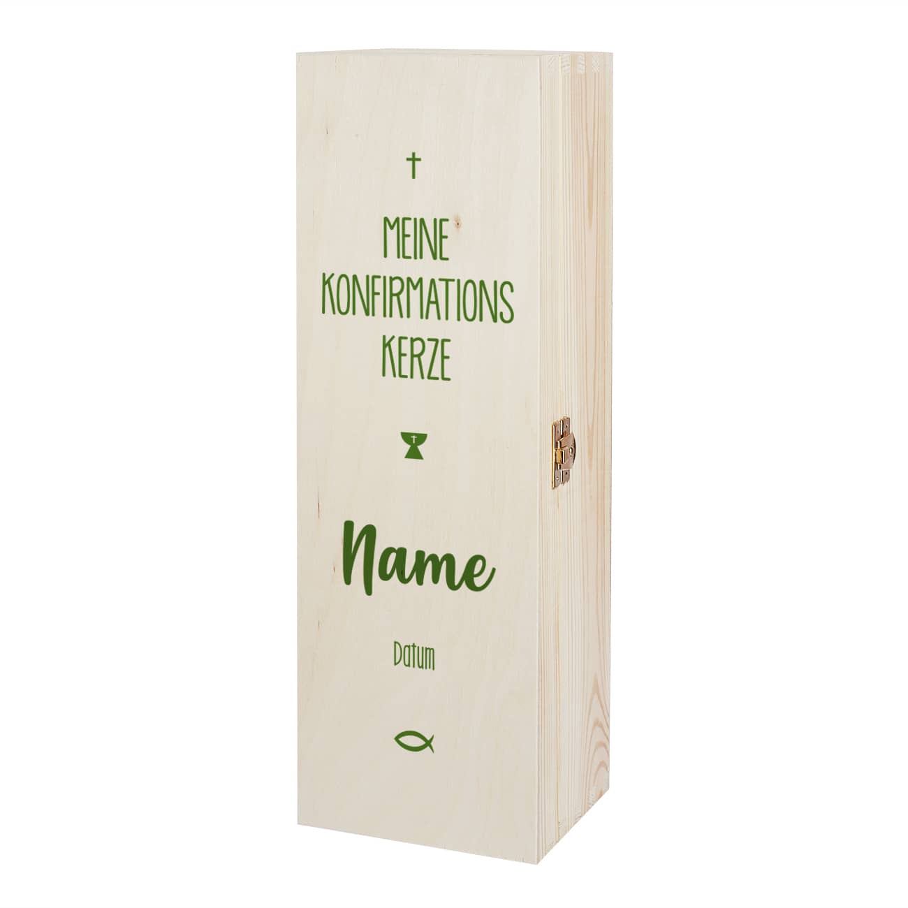 Die Personalisierung erhält die Holzkiste über den Aufdruck auf dem Deckel. Er wird zum festlichen Anlass mit so wichtigen religiösen Symbolen wie Kreuz, Kelch und Fisch gestaltet. Die Worte Meine Konfirmationskerze werden mit dem Namen des Konfirmanden / der Konfirmandin und dem Datum der Feier ergänzt. Damit der Aufdruck auch zu Ihrer Kerze und passt, steht Ihnen das Motiv in den Farben grün, blau und rosa zur Auswahl.