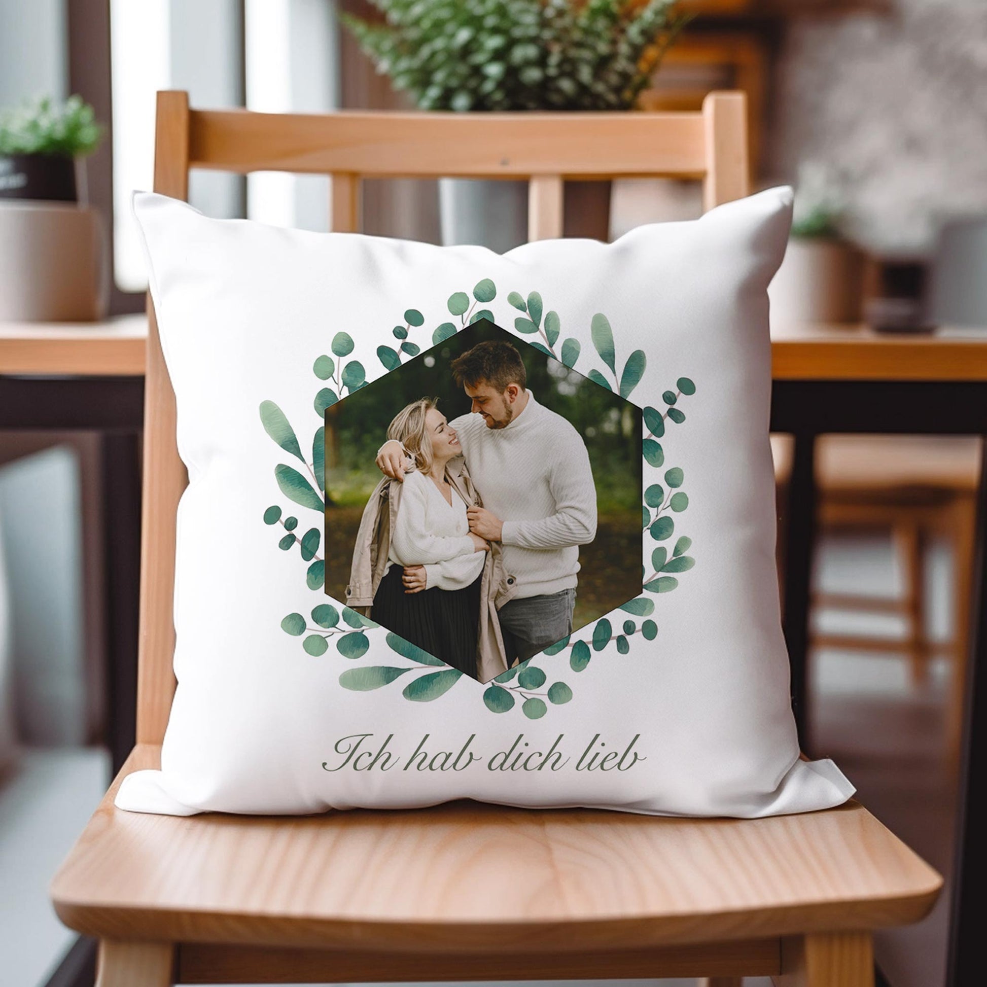 Gestalte ein individuelles Kissen mit deinem persönlichen Foto und Wunschtext, um besondere Momente stilvoll festzuhalten. Das Design wird durch einen zarten Eukalyptusblätter-Rahmen um das Bild ergänzt, was dem Kissen eine elegante und zeitlose Optik verleiht.