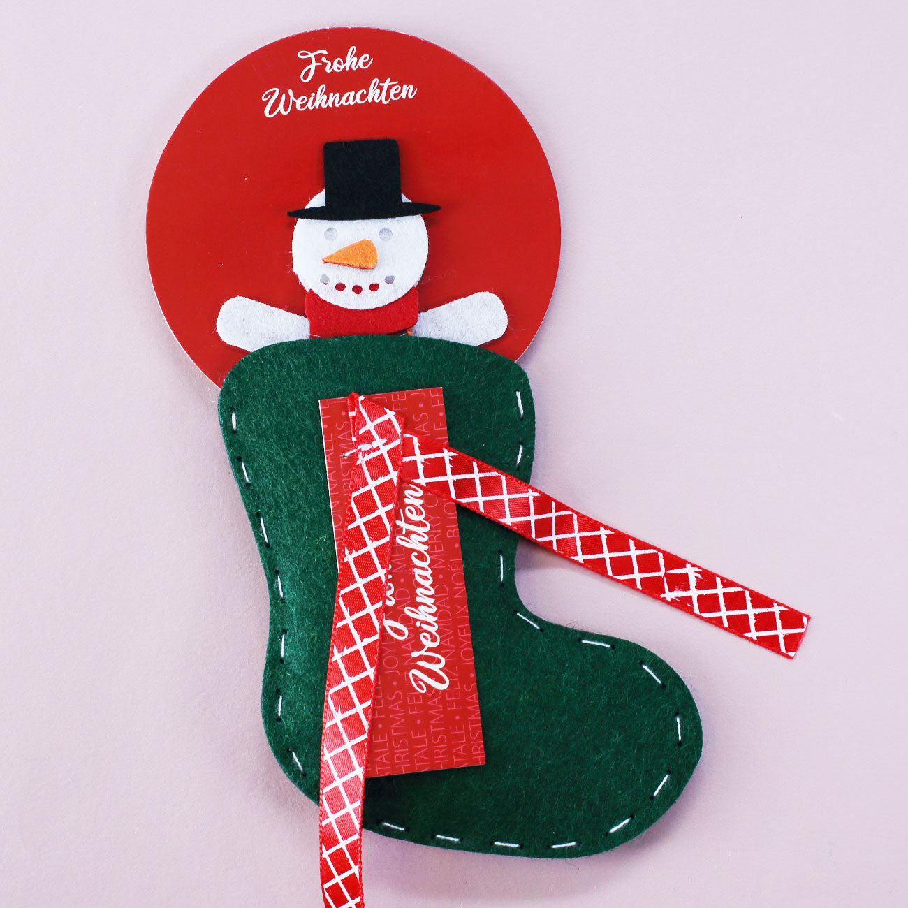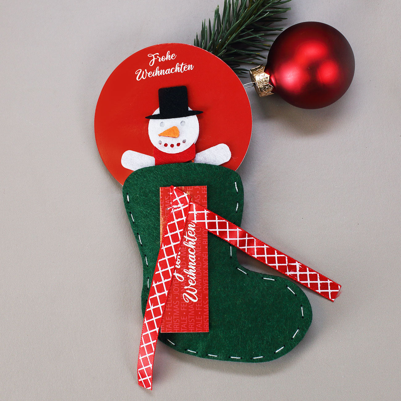 Mit dieser kleinen Filzsocke können Sie Geldgeschenke, Gutscheine und andere kleine Geschenke zu Weihnachten und zum Nikolaus originell überreichen. Die Filzsocke ist dunkelgrün und erhält ein Schild mit den Worten "Frohe Weihnachten" und eine rote Schleife. Oben aus der Filzsocke guckt noch ein niedlicher Schneemann, der einen sofort in festliche Stimmung bringt. Jetzt müssen Sie nur noch Ihr Geldgeschenk, andere Weihnachtsgeschenke oder Nikolausgeschenke oben in die Öffnung stecken - fertig ist der etwas andere Weihnachtsstrumpf!