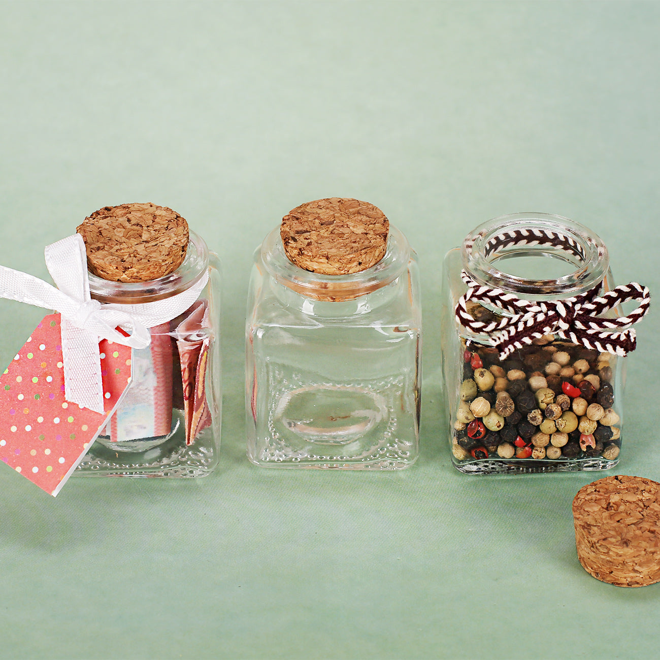 Diese niedliche Glasdose in Form eines Würfels eignet sich bestens als Gastgeschenk für Ihre Gäste. Egal ob Hochzeit, Silberhochzeit, Goldhochzeit oder zum runden Geburtstag, diese kleine Aufmerksamkeit wird begeistern. Das Gläschen wird mit einem Korkdeckel geliefert. Sie können es nach Belieben und passend zum Anlass füllen. In unseren Produktfotos zeigen wir Ihnen einige Beispiele auf, wie Sie das Geschenk gestalten können. Ob mit Kräutern, Konfetti oder kleinen Süßigkeiten, lassen Sie Ihrer Fantasie freien Lauf. Versehen mit einem gebastelten Namensschild weiß zudem noch jeder Gast wo er seinen Platz findet.