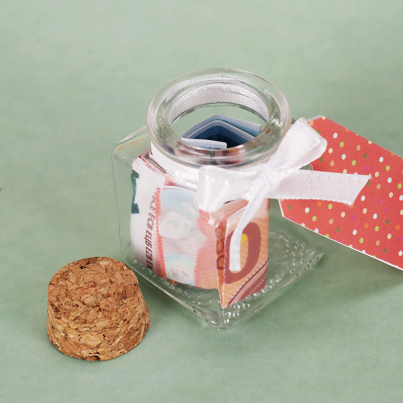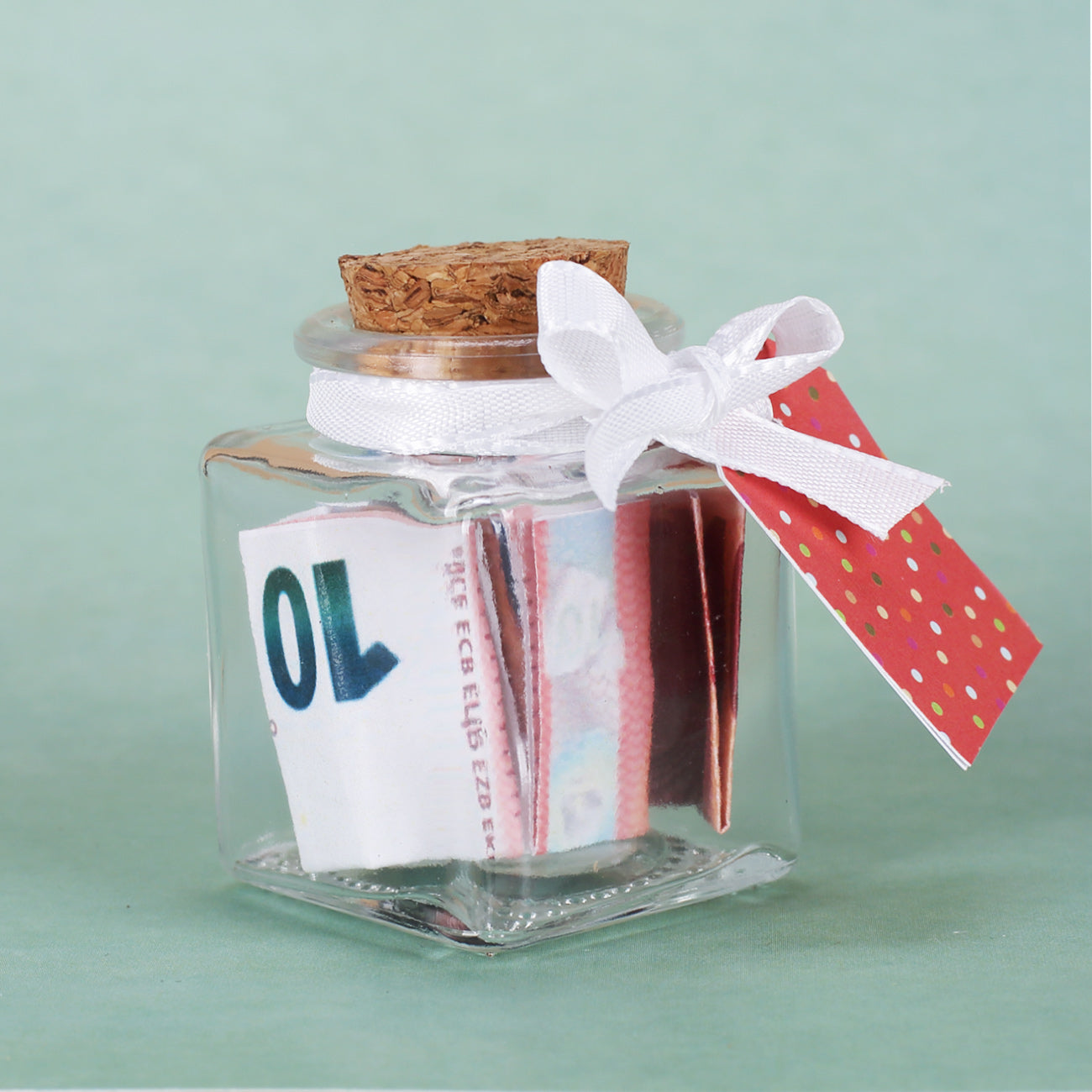 Tipp: Natürlich eignet sich dieses kleine Gläschen auch bestens für ein individuell gestaltetetes Geldgeschenk! Geldschein rein, Namensschild mit Glückwünschen dran, Schleife drumherum, fertig!