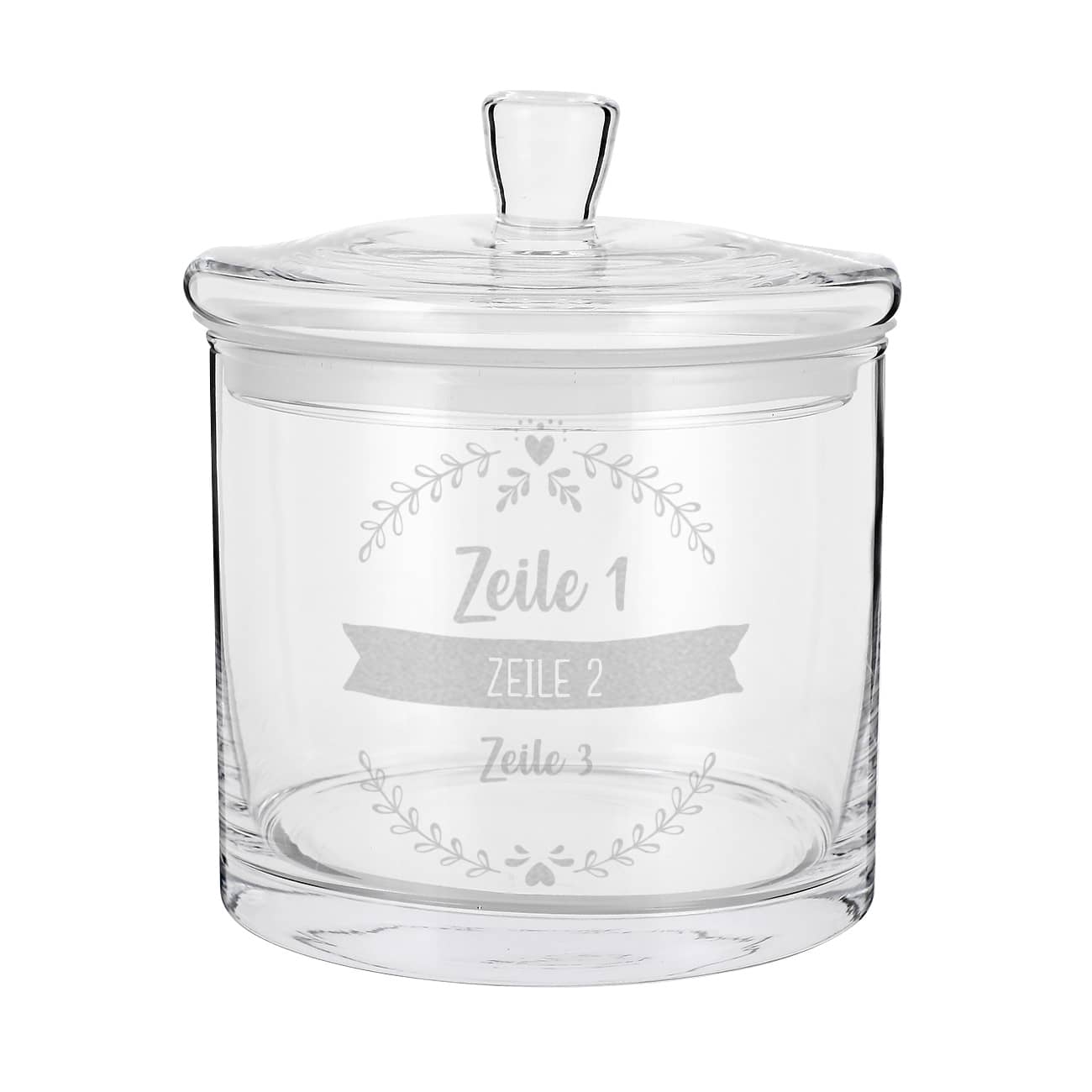 Die Aufbewahrungsdose aus Glas von Leonardo wird mit 3 Zeilen Ihres selbst gewählten Wunschtextes graviert. Somit können Sie die Glasdose ganz nach Belieben oder Anlass anpassen. Verzier werden Ihre Wunschtexte mit einem Rahmen aus Blätteranken und Herzen. Die Gravur erfolgt einseitig auf der Glasdose.