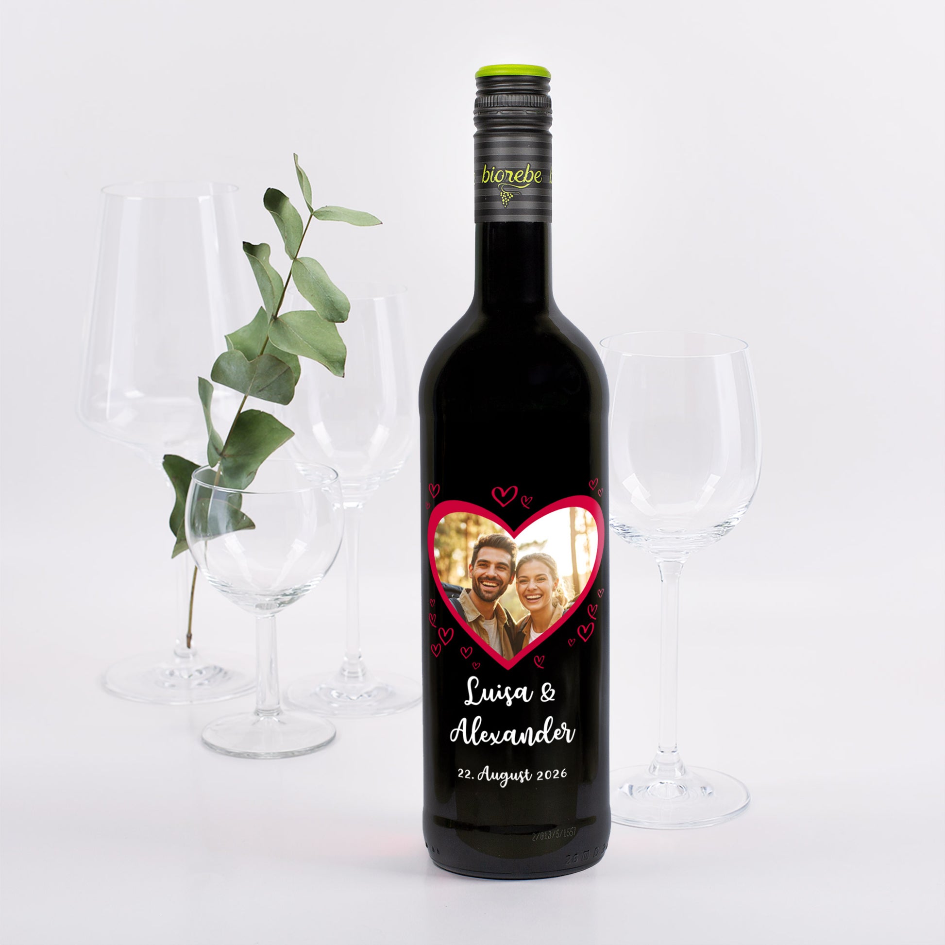 Biorebe Wein zur Hochzeit personalisiert mit Foto, Namen und Datum | Herzmotiv