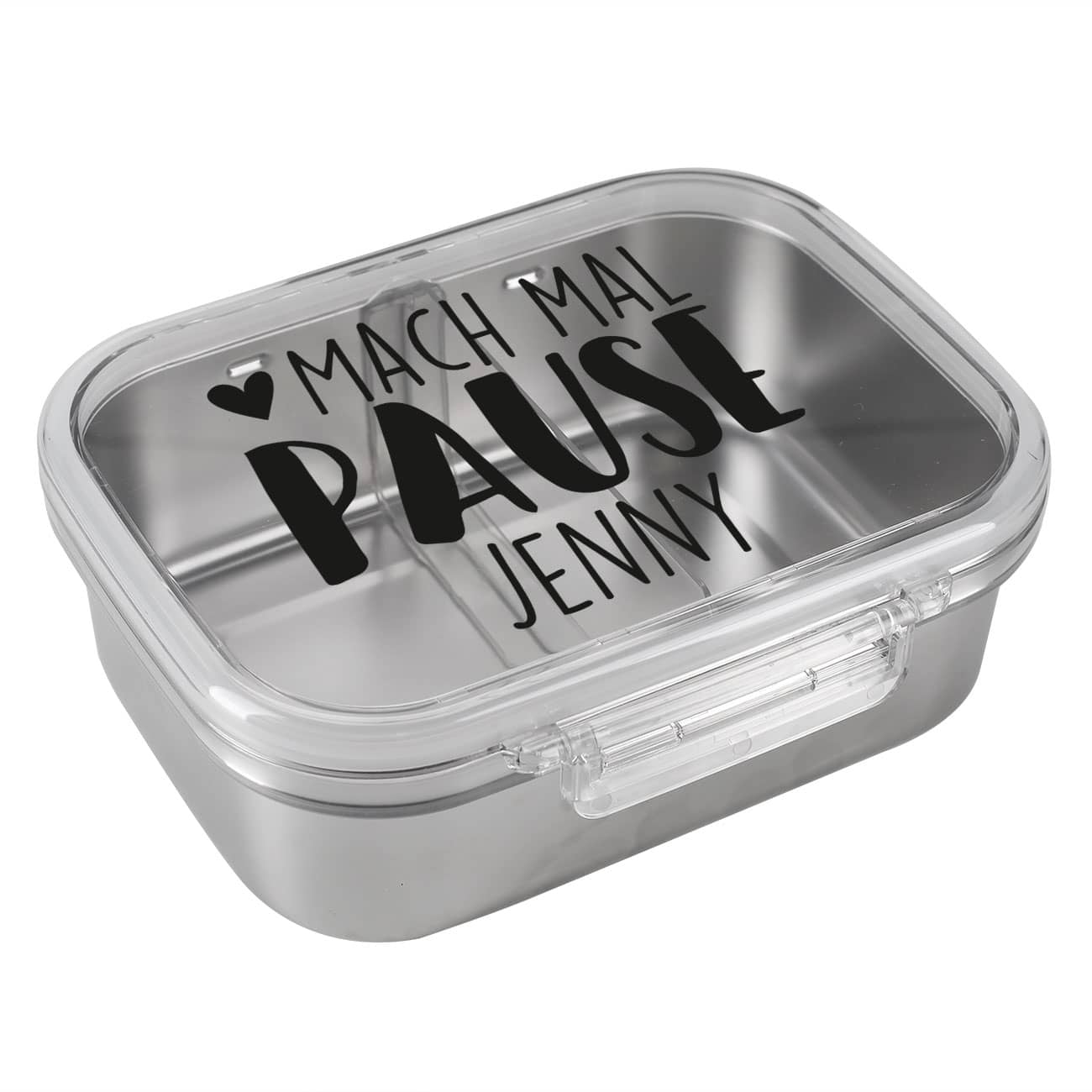 Edelstahlbrotdose mit schönem "Mach mal Pause"- Motiv und Wunschname