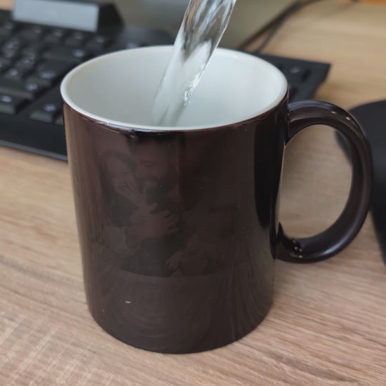 Design und Qualität: Die Tasse ist aus hochwertiger Keramik gefertigt und beeindruckt mit ihrem langlebigen Design. Dank des stilvollen schwarzen Finishs im kalten Zustand überrascht sie beim Einfüllen heißer Flüssigkeit, indem das Motiv sichtbar wird. Durch den Rundumdruck kommen alle vier Fotos perfekt zur Geltung, und der Wunschtext wird auf einem dekorativen farbigen Hintergrund abgebildet, was der Tasse eine besonders persönliche Note verleiht.