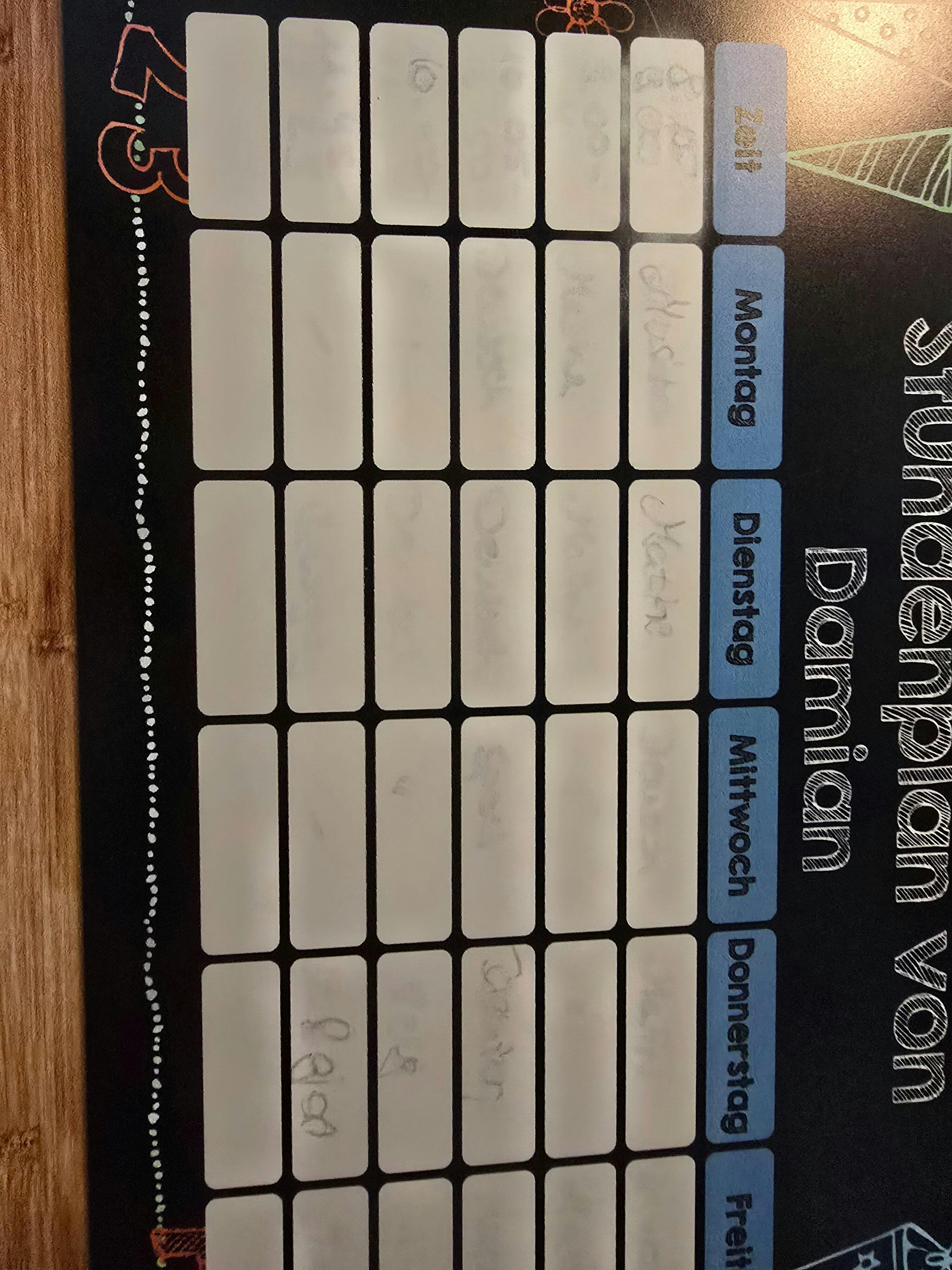 Haben den Stundenplan als Geschenk zur Einschulung für Freunde bestellt und sind sehr zufrieden. Schöne Verarbeitung, gute Qualität, tolle Idee! Ausprobiert haben wir allerdings noch nicht, also zB bezüglich Entfernung der Beschriftung.