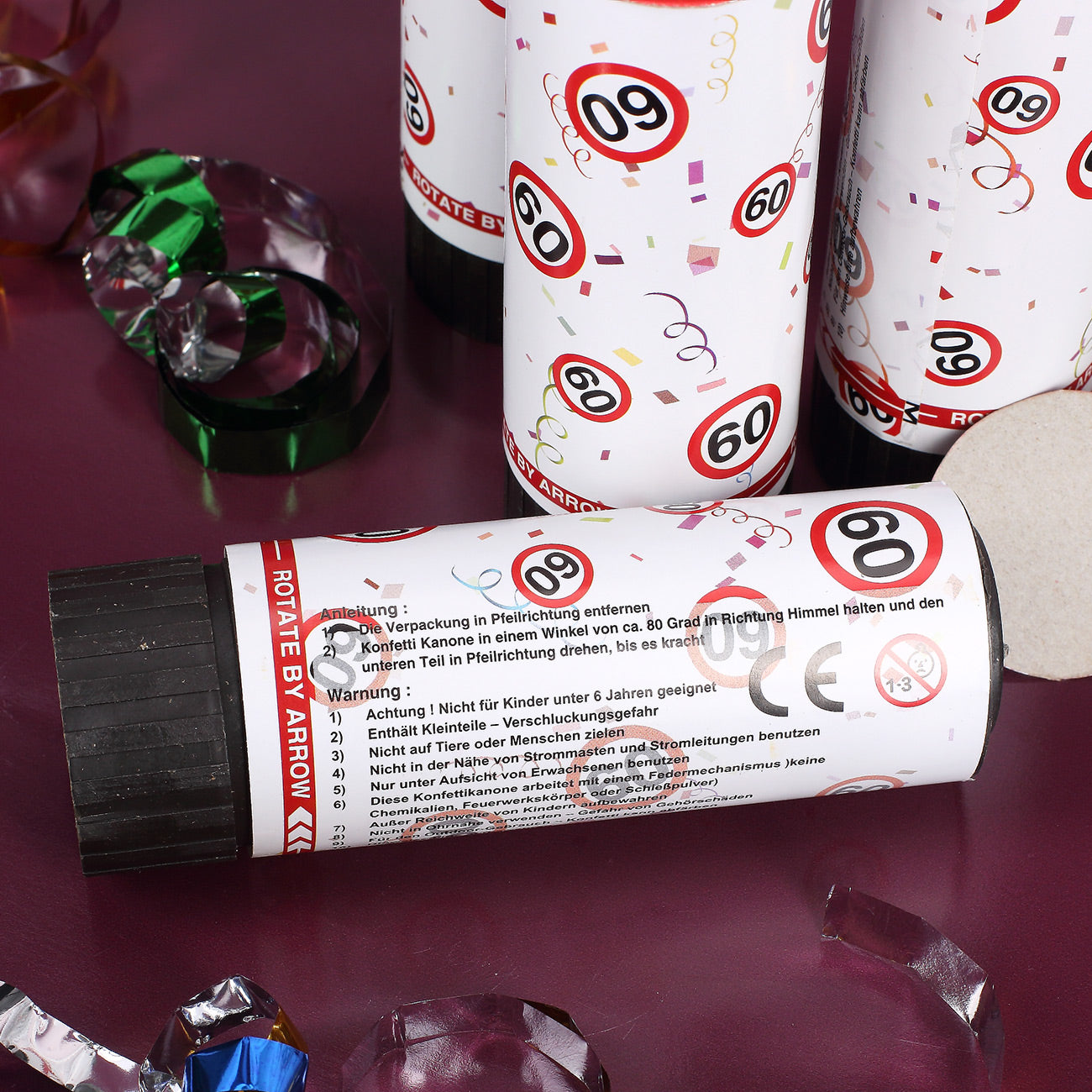 Diese Konfetti-Kanonen sorgen für spektakuläre Stimmung auf Ihrer Geburtstagsfeier! Denn nicht nur das Auslösen der Kanone ist ein echtes Highlight, sondern auch das glitzernde Konfetti und die Verkehrsschilder, welche anschließend den Raum schmückt. Passend zum runden Geburtstag gibt es die kleinen Konfetti-Shooter mit Verkehrszeichen und der passenden Zahl. Zur Verfügung Stehen die Zaheln: 18, 30, 40, 50, 60 und 70.