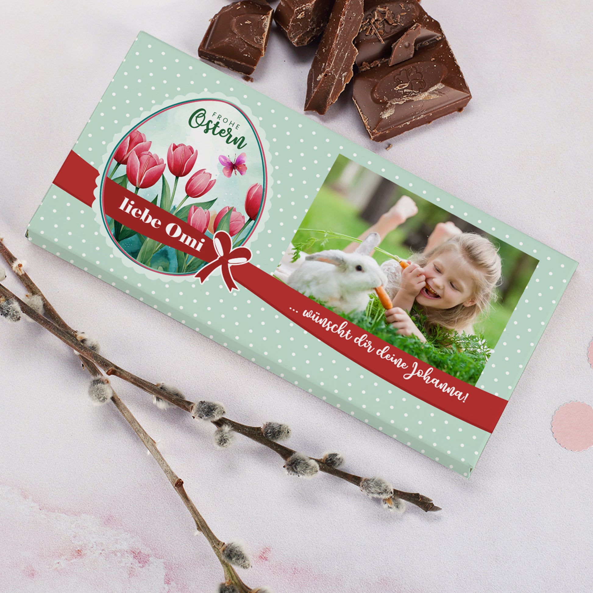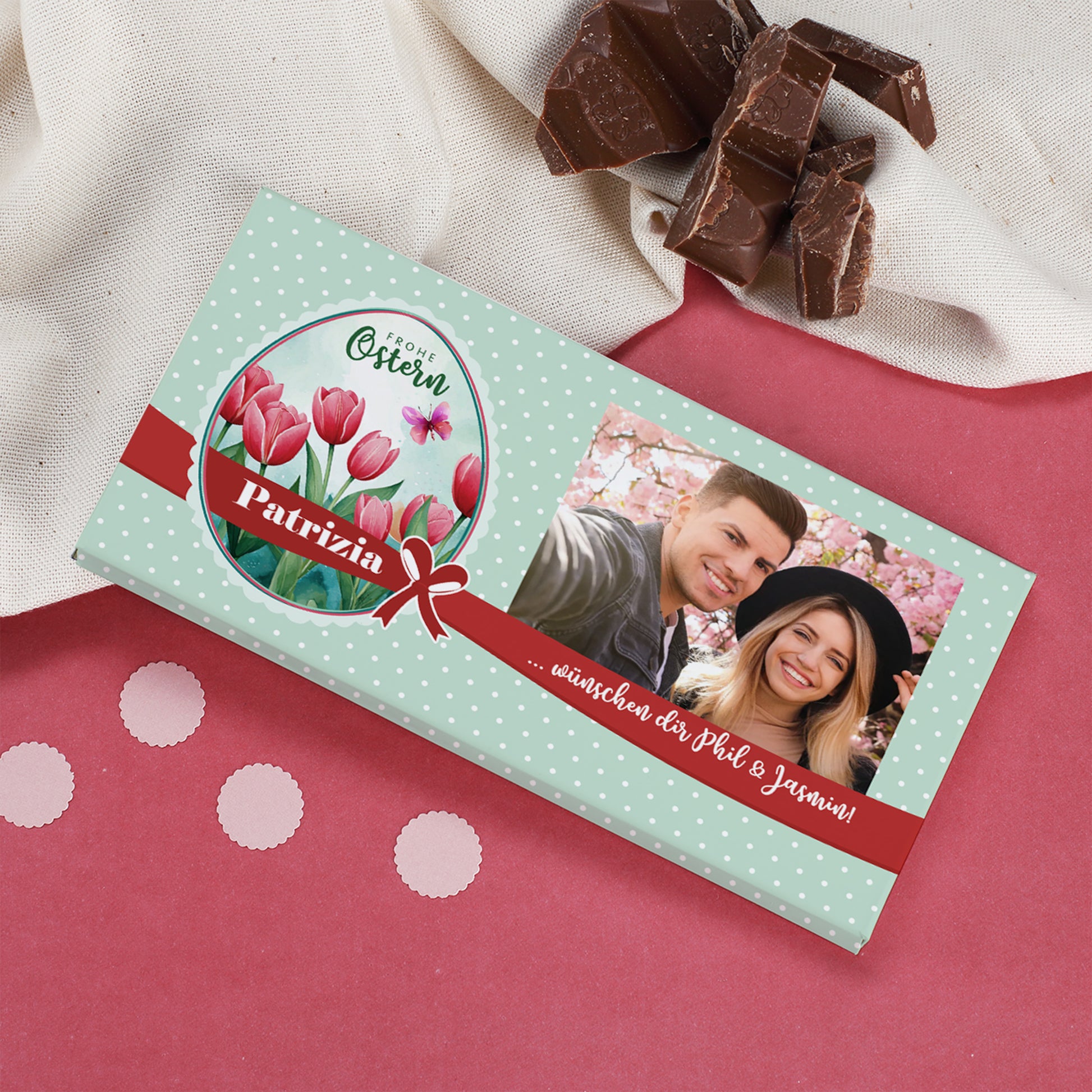 Personalisierte Osterschokolade – Vollmilchschokolade mit Tulpenmotiv & Foto