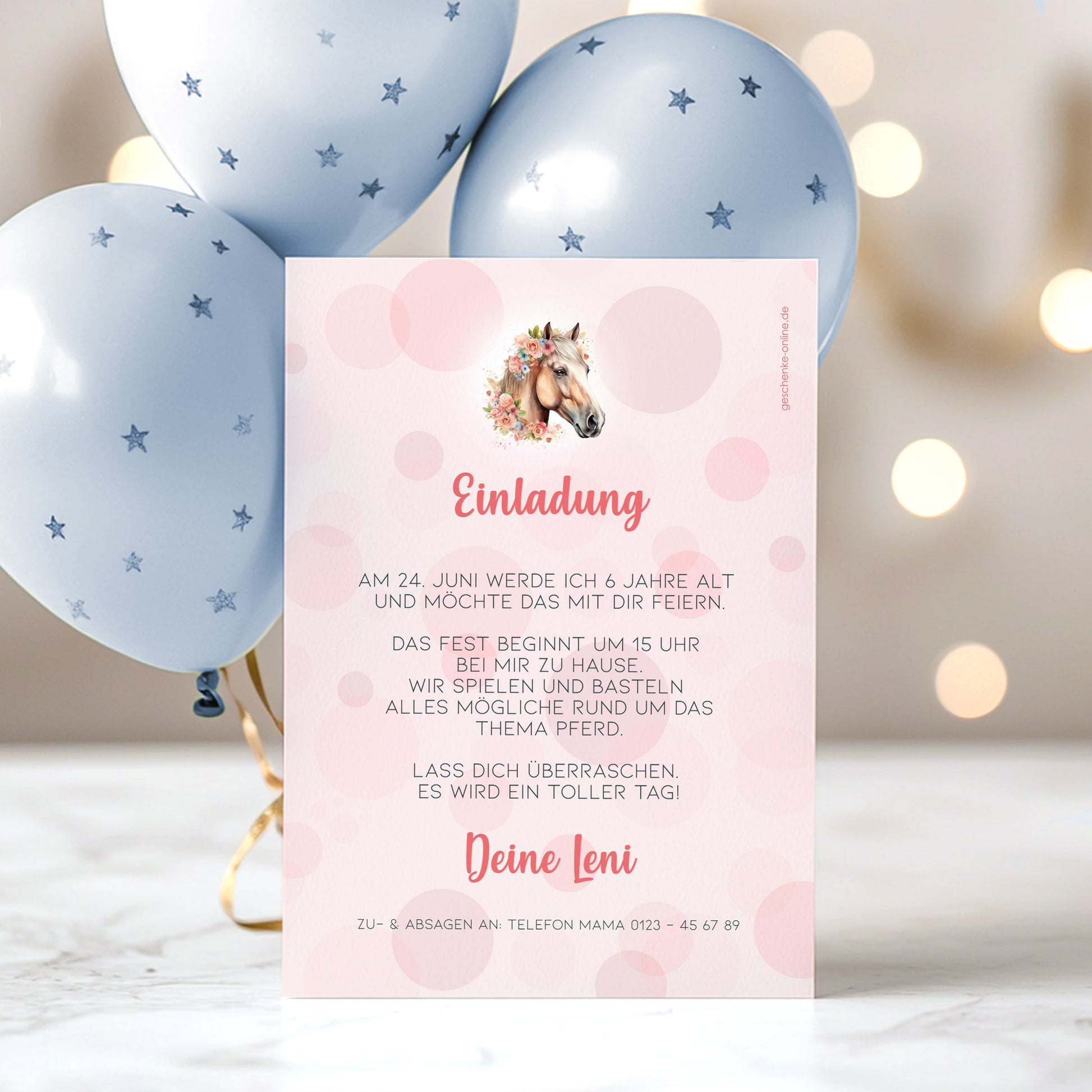Personalisierte Einladungskarte Kindergeburtstag – Pferdemotiv mit Blumen 🐴🌸🎉