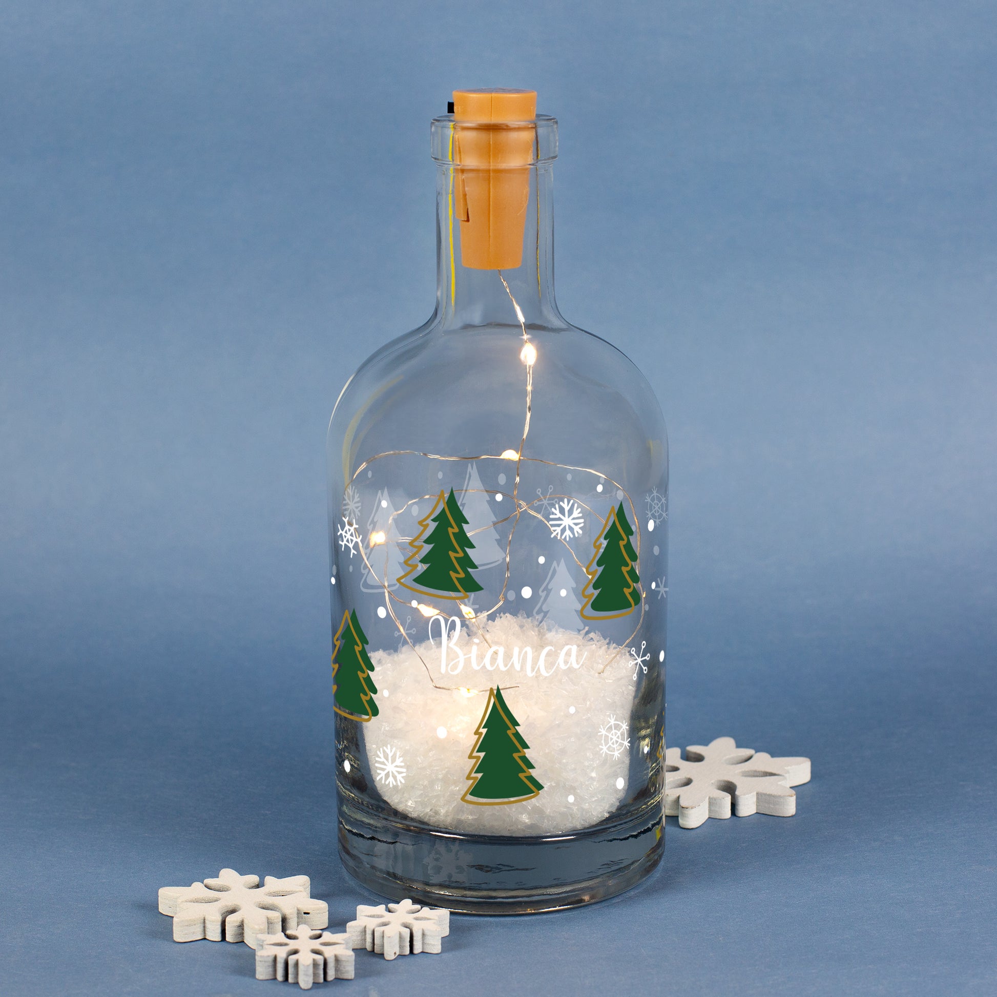 Personalisierte LED-Karaffe mit Tannenbaum-Motiv, Kunstschnee & Name – stimmungsvolle Weihnachtsdeko für jedes Zuhause
