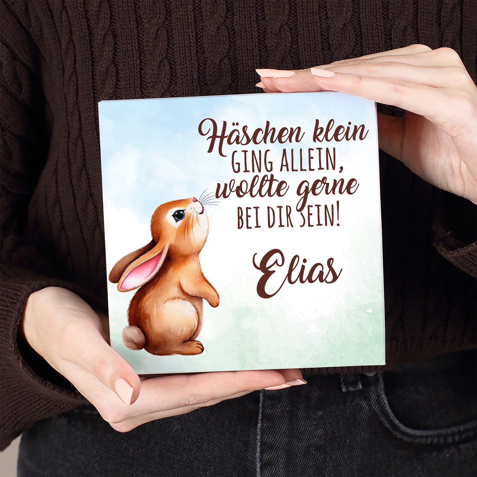 Pralinen zu Ostern mit Wunschname und Hasen-Motiv "Häschen klein ging allein, wollte gerne bei dir sein!"