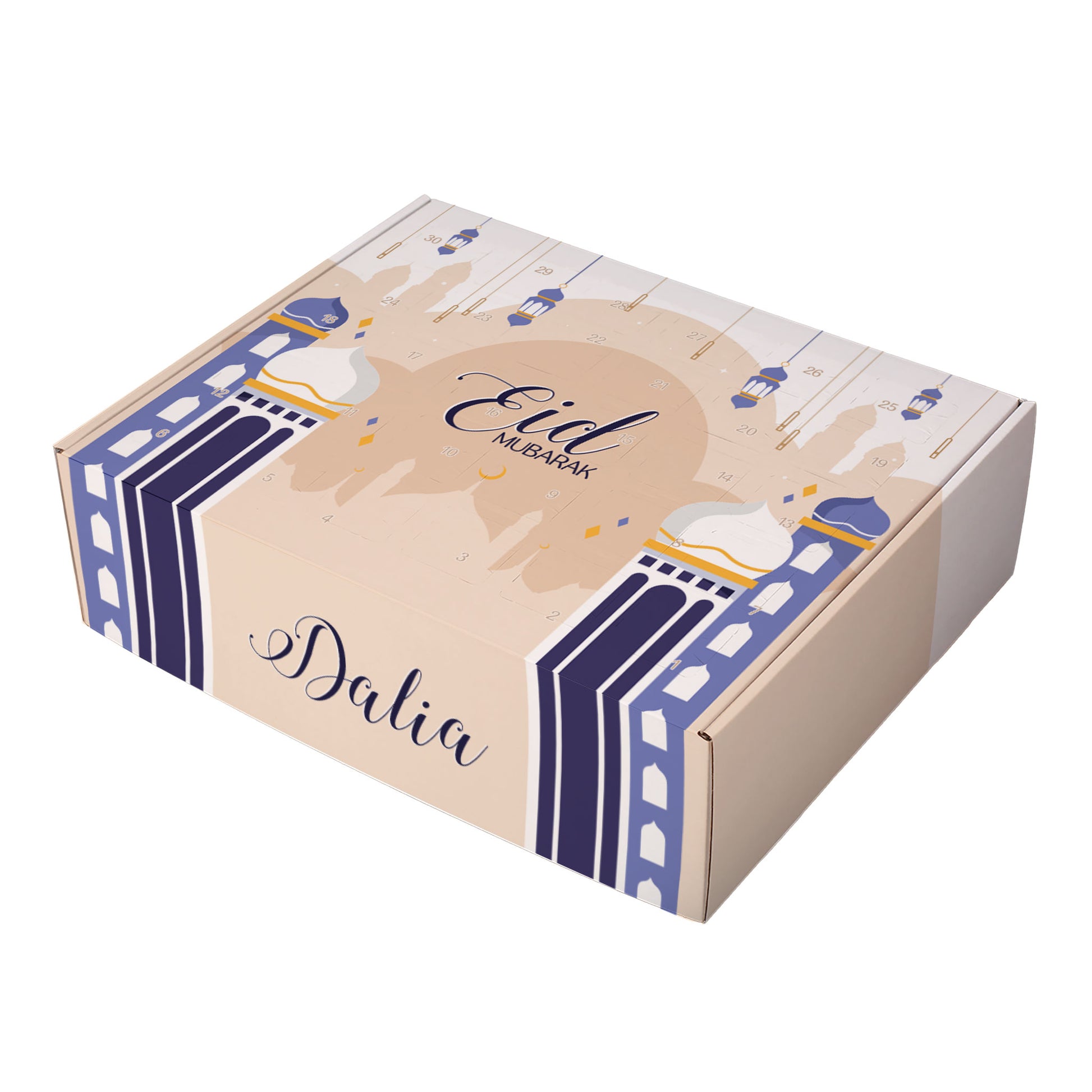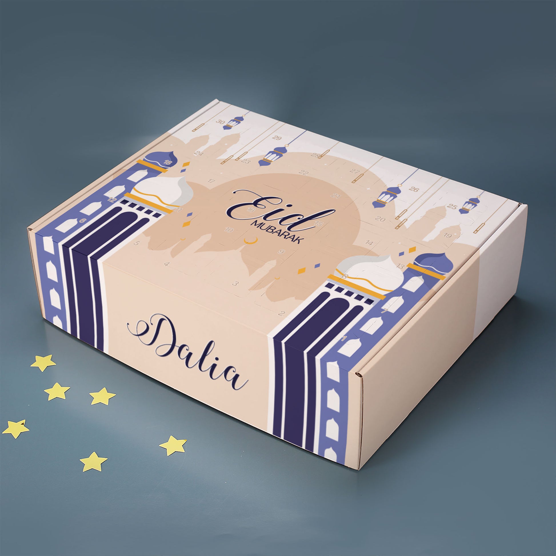 Dieser Ramadan Kalender zum selbst Befüllen erhält einen farbenfrohen Druck, der einen kleinen betenden Jungen, Laternen, Ornamente und im Hintergrund die Umrisse einer Moschee abbildet. Die Vorderseite bildet außerdem die Worte "Ramadan Mubarak" ab. So macht der Kalender zum Ramadan in jedem Kinderzimmer eine große Freude und dekoriert dieses erfolgreich passend zum Fastenmonat. Das Beste an diesem Kalender ist allerdings, dass er auch noch mit einem Namen nach Wunsch personalisiert wird. Achten Sie darauf, dass Sie den Namen korrekt eingeben, damit wir Ihnen das Geschenk mit Druck genau so herstellen und liefern können, wie Sie es auch haben möchten.