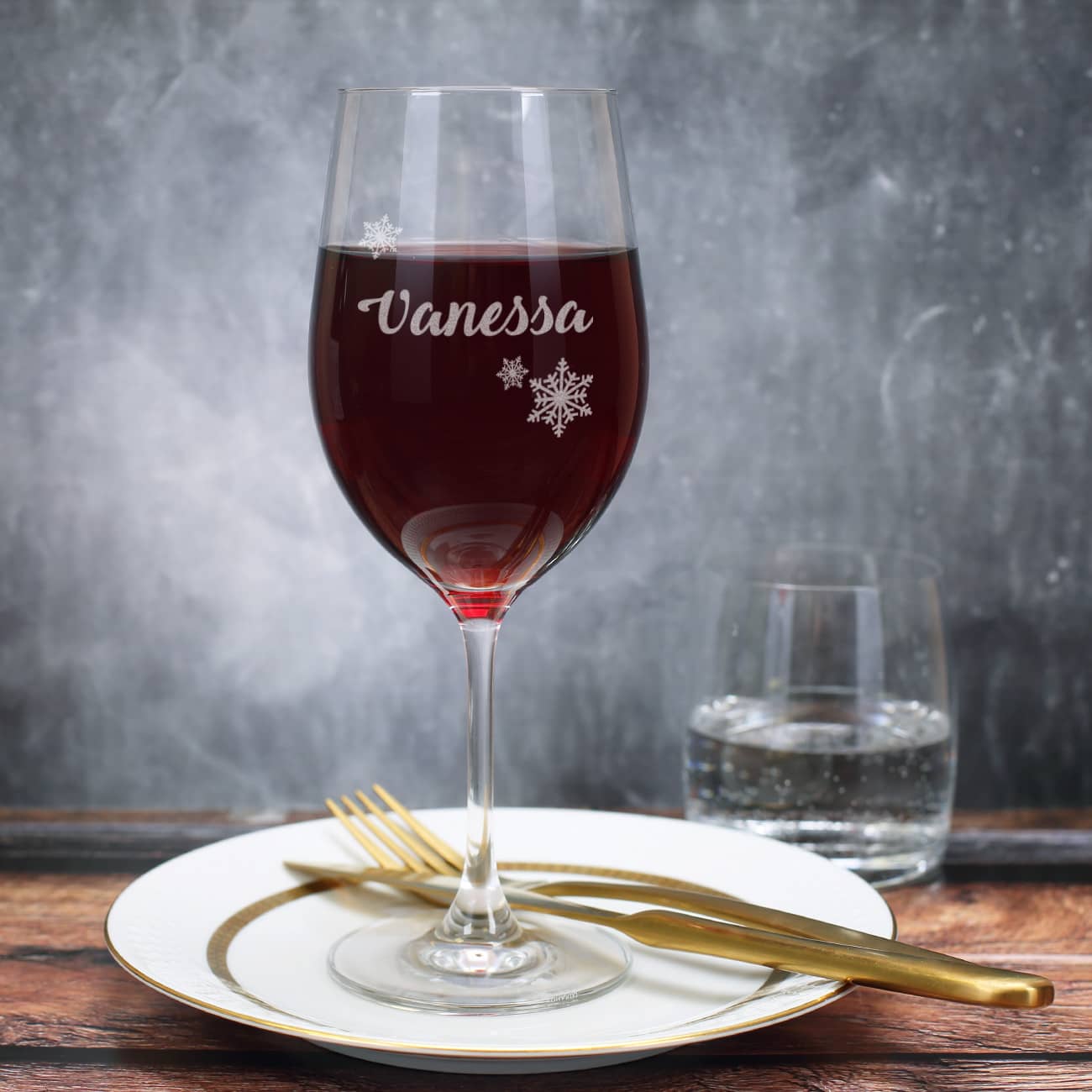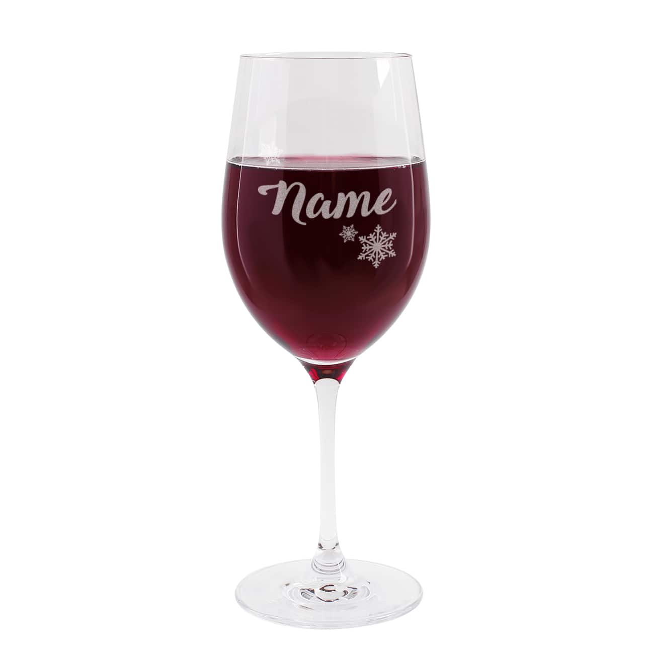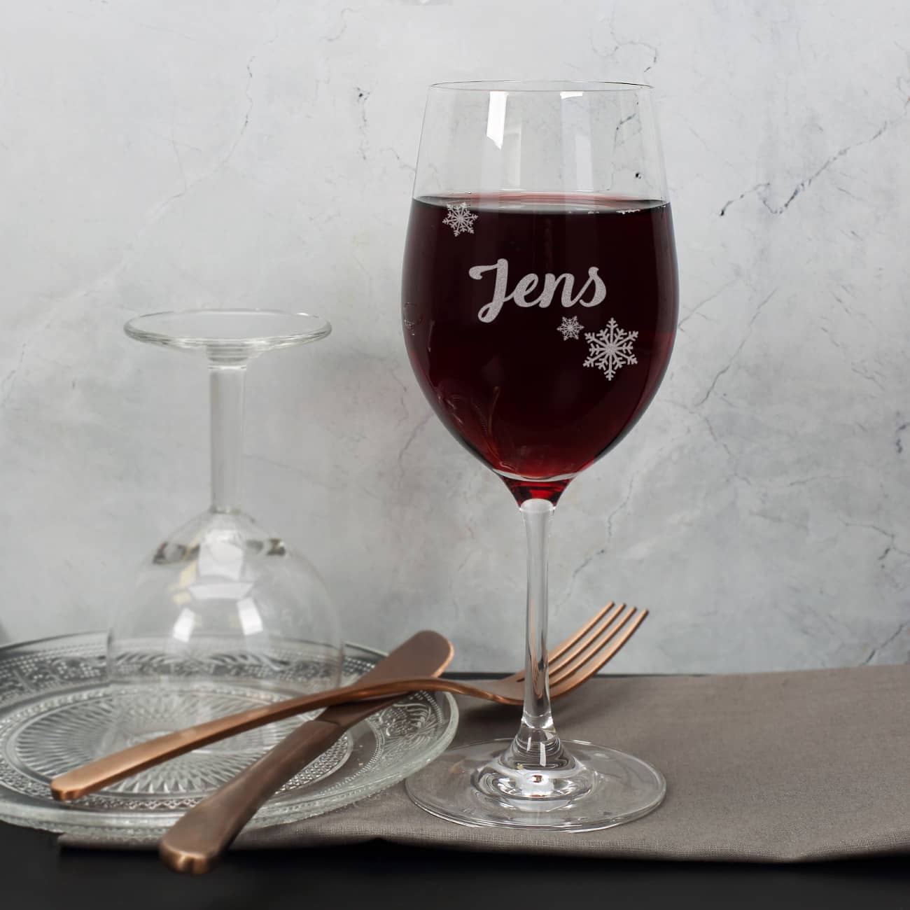 Rotweinglas mit dezenten Schneeflocken und Namensgravur