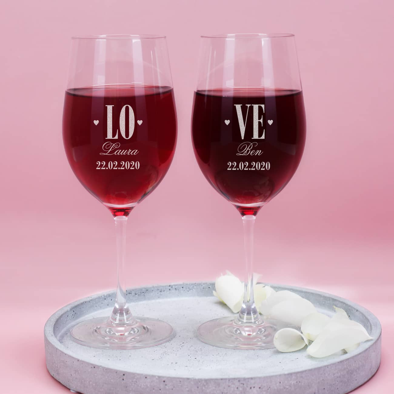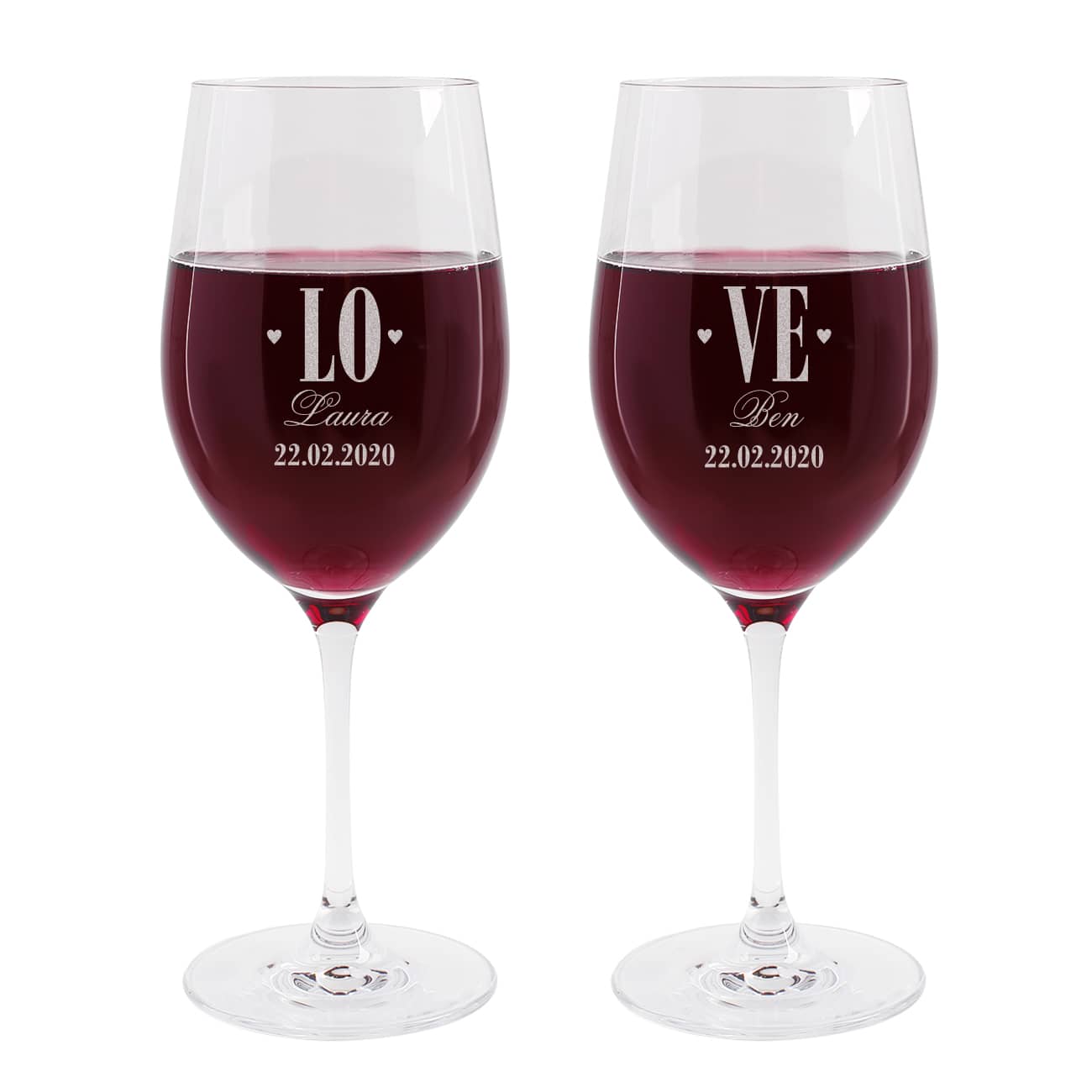 Rotweinglas Set Love mit Herzen und Gravur