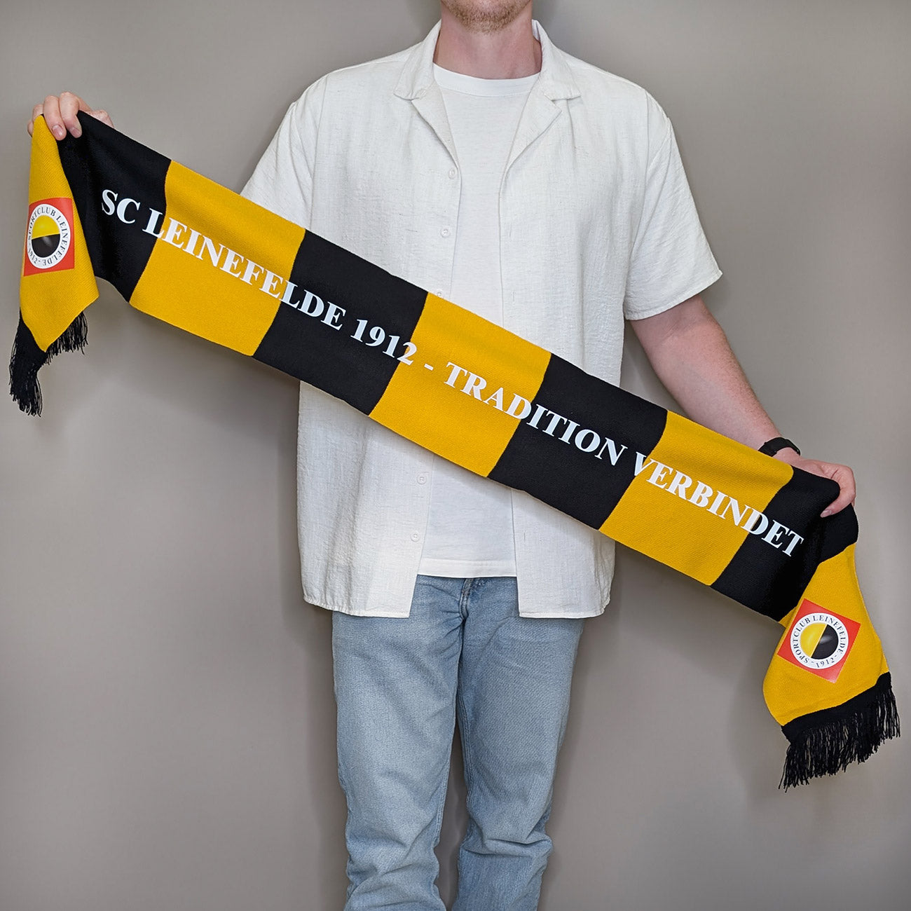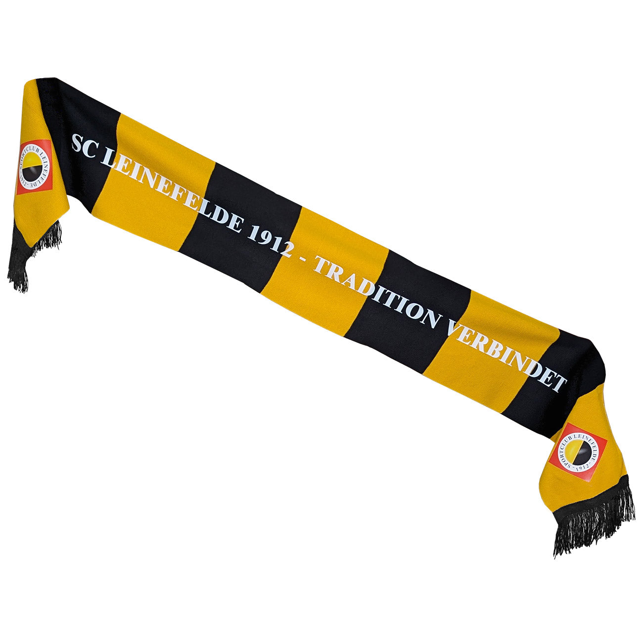 Echte Vereinsliebe zum Umhängen! Der SC Leinefelde 1912 Fanschal im klassischen Blockdesign in Gelb-Schwarz trägt stolz den Slogan „TRADITION VERBINDET“ und das Vereinswappen an beiden Enden. Ob am Spieltag Zuhause, bei Auswärtsspielen oder als modisches Statement – dieser Schal ist das ultimative Accessoire für wahre Fans.