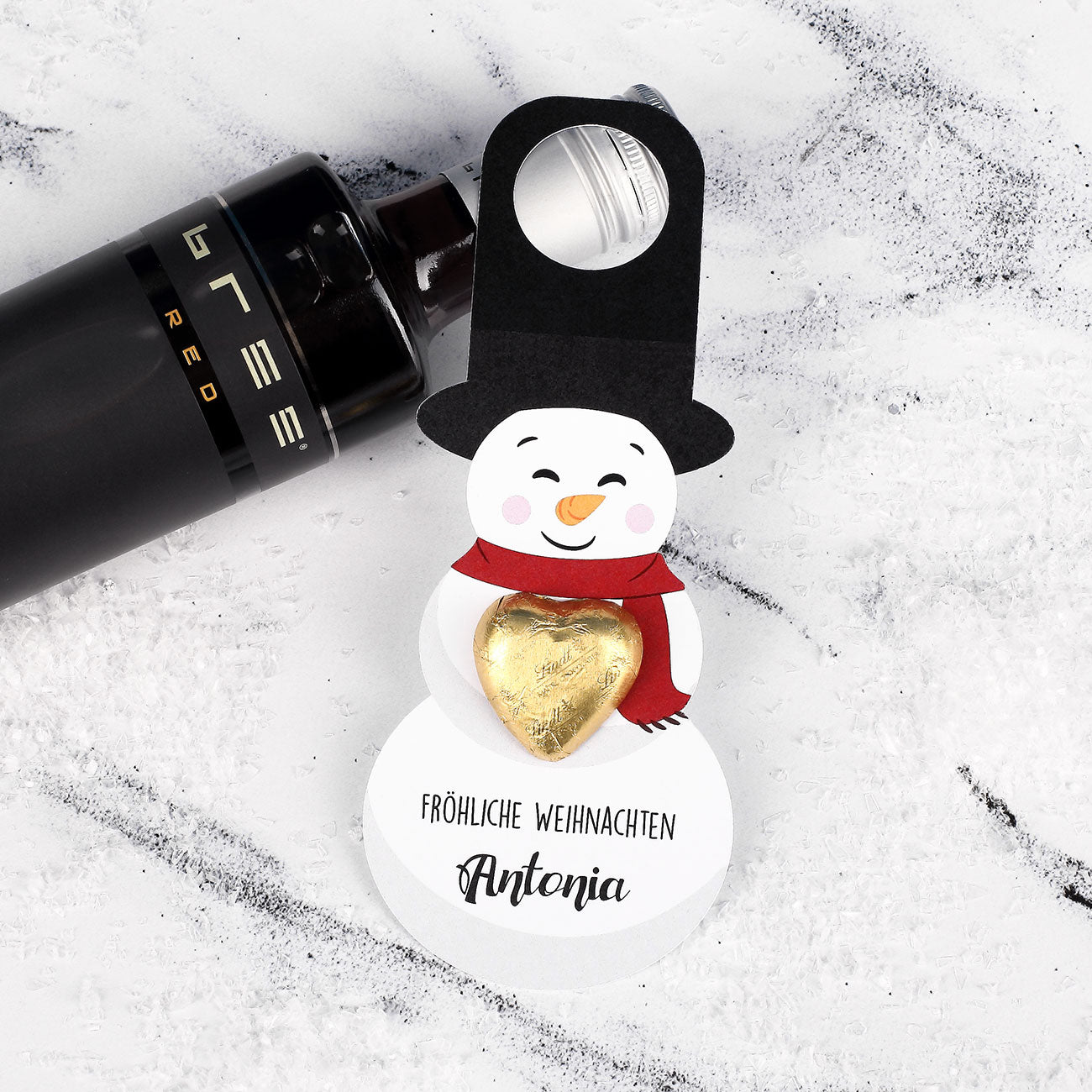 Schneemann-Flaschenanhänger mit Schokoladenherz und Name