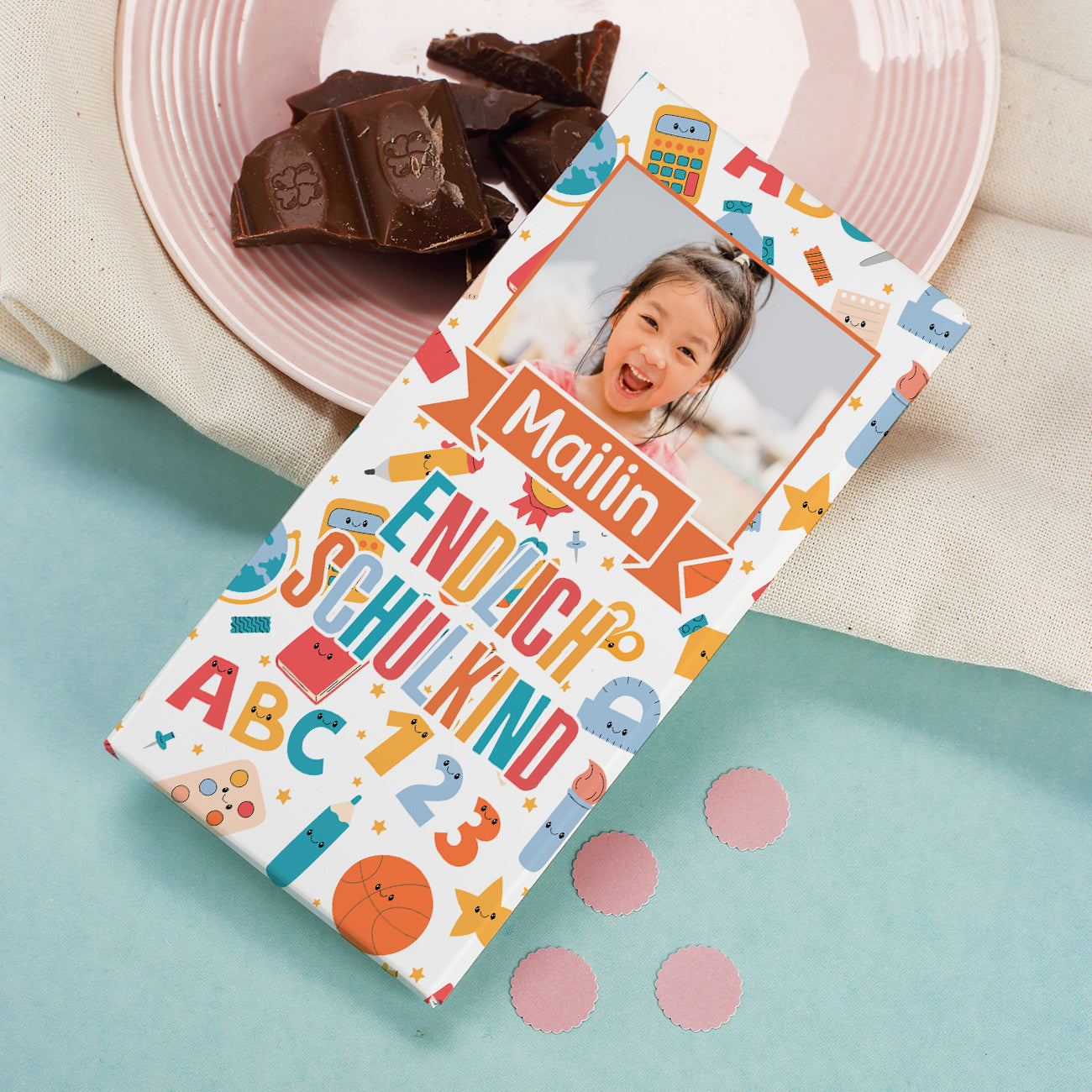 Versüße den ersten Schultag mit einer besonderen Überraschung! Diese 100g Tafel Schokolade ist das perfekte Geschenk zur Einschulung und kann individuell mit einem Foto und einem Wunschnamen gestaltet werden.