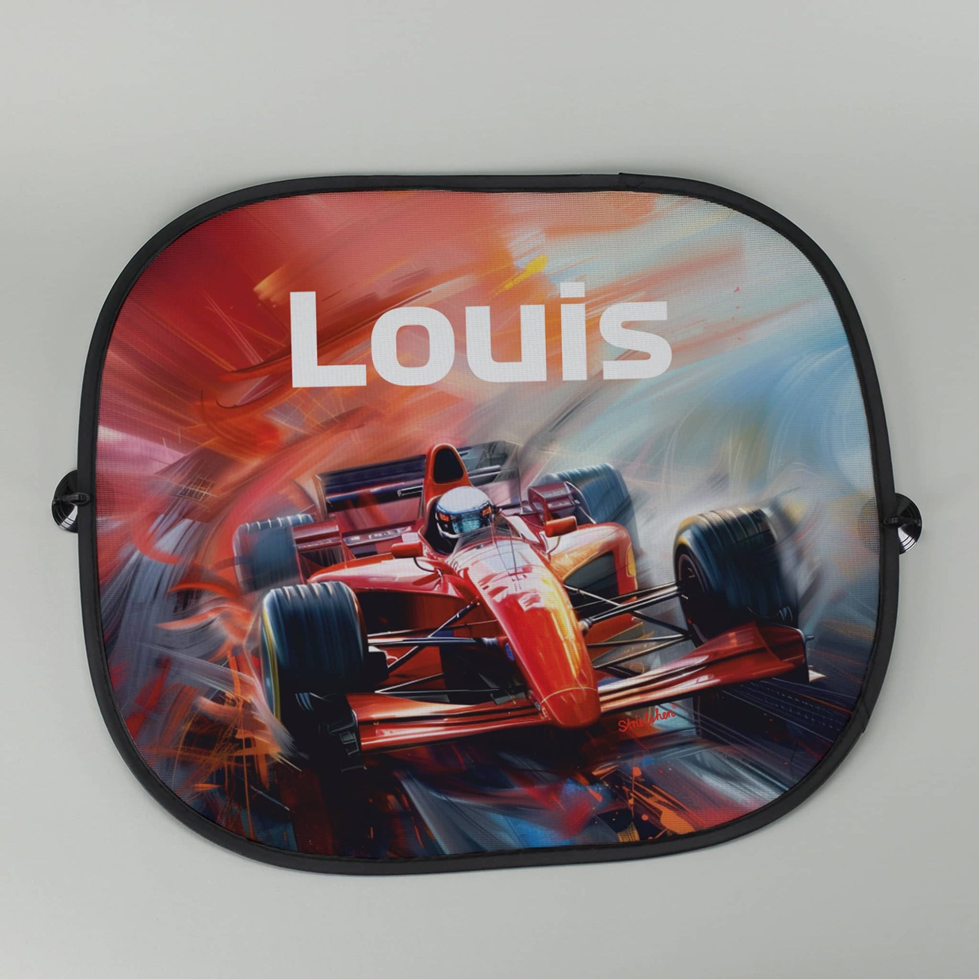 Sonnenschutz für Autofenster mit Rennwagenmotiv und Name verziert