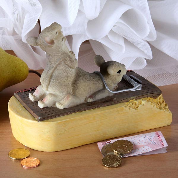 Mit dieser Spardose als Geschenk werden Sie sicher einen Volltreffer landen, vor allem wenn sie gut gefüllt ist, denn über kleine Reserven freut sich jeder. Die Spardose ist aus Polyresin, hat eine Breite von 17 cm und eine Höhe von ca. 12,5 cm. Die Spardose ist in der Form eines Käsestücks gestaltet, auf dem eine Mausefalle und zwei Mäuse stehen. Eine der Maus ist in der Falle gefangen, die andere sitzt dahinter und freut sich.