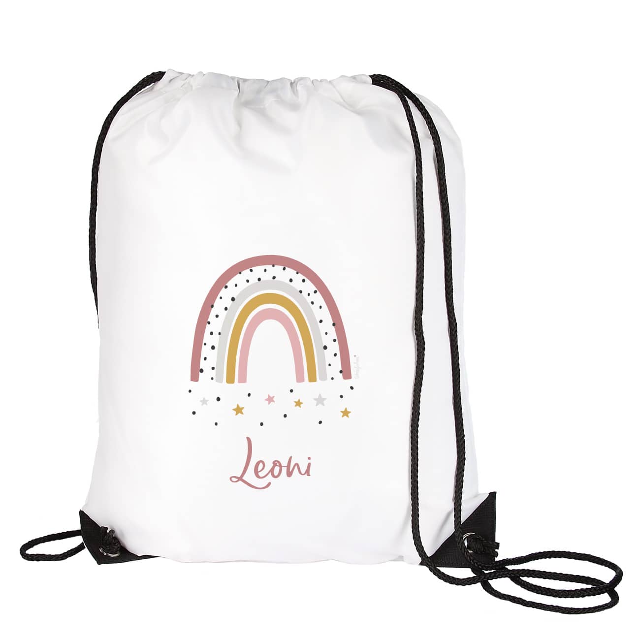 • Einseitiger Druck: Das hübsche Regenbogenmotiv und der Name des Kindes sind auf einer Seite des Beutels aufgedruckt und machen ihn zu einem echten Hingucker.
